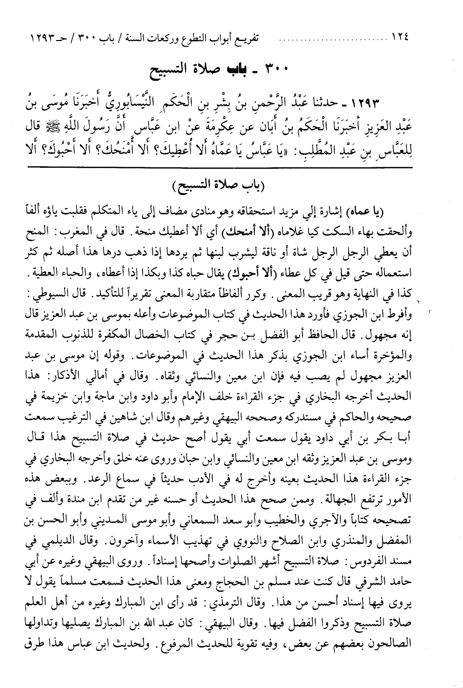 وقال الترمذي قد رأى بن الْمُبَارَكِ وَغَيْرُهُ مِنْ أَهْلِ الْعِلْمِ صَلَاةَ التَّسْبِيحِ وَذَكَرُوا الْفَضْلَ فِيهَا