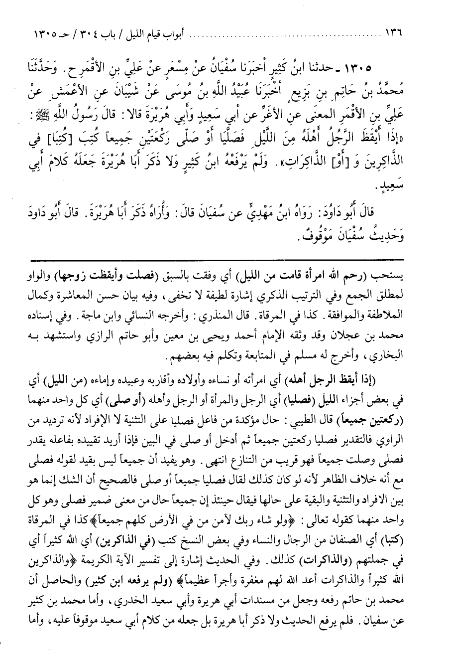 [1309] (إِذَا أيقظ الرجل أهله) أي امرأته أو نسائه وَأَوْلَادَهُ وَأَقَارِبَهُ وَعَبِيدَهُ وَإِمَاءَهُ (مِنَ اللَّيْلِ) أَيْ فِي بَعْضِ أَجْزَاءِ اللَّيْلِ (فَصَلَّيَا) أَيِ الرَّجُلُ وَالْمَرْأَةُ أَوِ الرَّجُلُ وَأَهْلُهُ (أَوْ صَلَّى) أَيْ كُلُّ وَاحِدٍ مِنْهُمَا (رَكْعَتَيْنِ جَمِيعًا) قَالَ الطِّيبِيُّ حَالٌ مُؤَكَّدَةٌ مِنْ فَاعِلِ فَصَلَّيَا عَلَى التَّثْنِيَةِ لَا الْإِفْرَادِ لِأَنَّهُ تَرْدِيدٌ مِنَ الرَّاوِي فَالتَّقْدِيرُ فَصَلَّيَا رَكْعَتَيْنِ جَمِيعًا ثُمَّ أَدْخَلَ أَوْ صَلَّى فِي الْبَيْنِ فَإِذَا أُرِيدَ تَقْيِيدُهُ بِفَاعِلِهِ يُقَدَّرُ فَصَلَّى وَصَلَّتْ جَمِيعًا فَهُوَ قَرِيبٌ مِنَ التَّنَازُعِ انْتَهَى