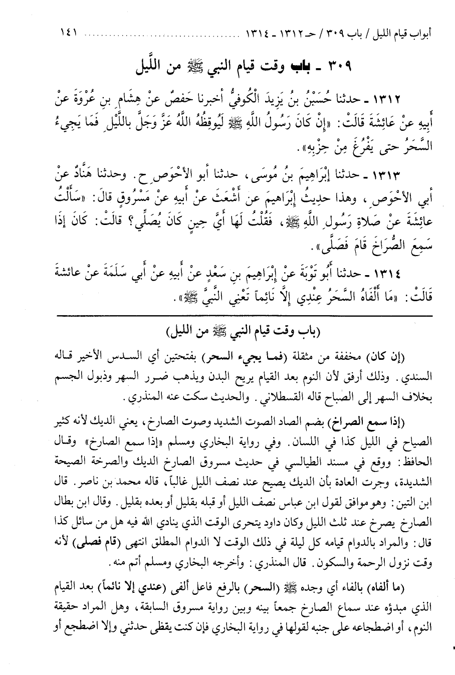 [1318] (مَا أَلْفَاهُ) بِالْفَاءِ أَيْ وَجَدَهُ صَلَّى اللَّهُ عَلَيْهِ وَسَلَّمَ (السَّحَرُ) بِالرَّفْعِ فَاعِلُ أَلْفَى (عِنْدِي إِلَّا نَائِمًا) بَعْدَ الْقِيَامِ الَّذِي مَبْدَؤُهُ عِنْدَ سَمَاعِ الصَّارِخِ جَمْعًا بَيْنَهُ وَبَيْنَ رِوَايَةِ مَسْرُوقٍ السَّابِقَةِ وَهَلِ الْمُرَادُ حَقِيقَةُ النَّوْمِ أَوِ اضْطِجَاعُهُ عَلَى جَنْبِهِ لِقَوْلِهَا فِي رِوَايَةِ الْبُخَارِيِّ فَإِنْ كُنْتُ يَقْظَى حَدَّثَنِي وَإِلَّا اضطجع أو