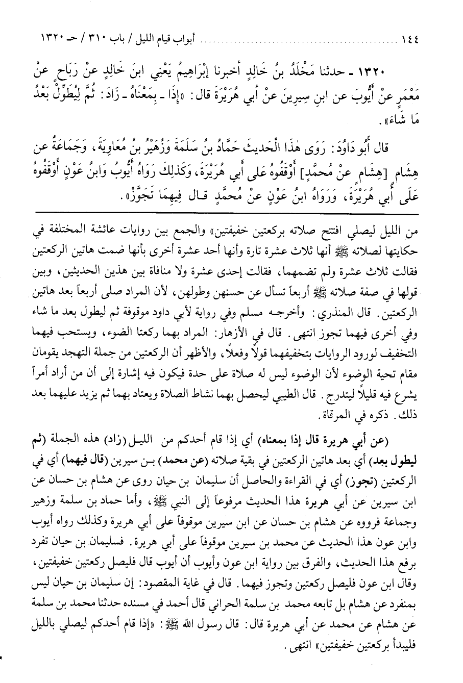 [1324] (عَنْ أبي هريرة قال إذا بمعناه) أي إذ قَامَ أَحَدُكُمْ مِنَ اللَّيْلِ (وَزَادَ) هَذِهِ الْجُمْلَةَ (ثُمَّ لِيُطَوِّلَ بَعْدُ) أَيْ بَعْدَ هَاتَيْنِ الرَّكْعَتَيْنِ فِي بَقِيَّةِ صَلَاتِهِ (عَنْ مُحَمَّدِ) بْنِ سِيرِينَ (قَالَ فِيهِمَا) أَيْ فِي الرَّكْعَتَيْنِ (تَجَوَّزْ) أَيْ فِي الْقِرَاءَةِ وَالْحَاصِلُ أَنَّ سُلَيْمَانَ بْنَ حَيَّانَ روى عن هشام بن حسان عن بن سِيرِينَ عَنْ أَبِي هُرَيْرَةَ هَذَا الْحَدِيثُ مَرْفُوعًا إِلَى النَّبِيِّ صَلَّى اللَّهُ عَلَيْهِ وَسَلَّمَ وَأَمَّا حَمَّادُ بْنُ سَلَمَةَ وَزُهَيْرٌ وَجَمَاعَةٌ فَرَوَوْهُ عَنْ هشام بن حسان عن بن سِيرِينَ مَوْقُوفًا عَلَى أَبِي هُرَيْرَةَ وَكَذَلِكَ رَوَى أيوب وبن عَوْنٍ هَذَا الْحَدِيثَ عَنْ مُحَمَّدِ بْنِ سِيرِينَ مَوْقُوفًا عَلَى أَبِي هُرَيْرَةَ