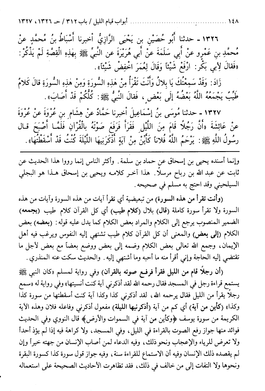 [1331] (أَنَّ رَجُلًا قَامَ مِنَ اللَّيْلِ فَقَرَأَ فَرَفَعَ صَوْتَهُ بِالْقُرْآنِ) وَفِي رِوَايَةٍ لِمُسْلِمٍ كَانَ النَّبِيُّ صَلَّى اللَّهُ عَلَيْهِ وَسَلَّمَ يَسْتَمِعُ قِرَاءَةَ رَجُلٍ فِي الْمَسْجِدِ فَقَالَ رَحِمَهُ اللَّهُ لَقَدْ أَذَكَرَنِي آيَةً كُنْتُ أُنْسِيتُهَا وَفِي رِوَايَةٍ لَهُ سَمِعَ رَجُلًا يَقْرَأُ مِنَ اللَّيْلِ فَقَالَ يَرْحَمُهُ اللَّهُ لَقَدْ أَذْكَرَنِي كَذَا وَكَذَا آيَةً كُنْتُ أَسْقَطْتُهَا مِنْ سُورَةِ كَذَا وَكَذَا (كَأَيِّنْ مِنْ آيَةٍ) أَيْ كَمْ مِنْ آيَةٍ (أَذْكَرَنِيهَا اللَّيْلَةَ) مَفْعُولُ أَذَكَرَنِي وَفَاعِلُهُ فُلَانٌ وَهَذِهِ الْآيَةُ الْكَرِيمَةُ مِنْ سُورَةِ يُوسُفَ وَكَأَيِّنْ مِنْ آية في السماوات والأرض قَالَ النَّوَوِيُّ وَفِي الْحَدِيثِ فَوَائِدُ مِنْهَا جَوَازُ رَفْعِ الصَّوْتِ بِالْقِرَاءَةِ فِي اللَّيْلِ وَفِي الْمَسْجِدِ وَلَا كَرَاهَةَ فِيهِ إِذَا لَمْ يُؤْذِ أَحَدًا وَلَا تَعَرَّضَ لِلرِّيَاءِ وَالْإِعْجَابِ وَنَحْوِ ذَلِكَ وَفِيهِ الدُّعَاءُ لِمَنْ أَصَابَ الْإِنْسَانُ مِنْ جِهَتِهِ خَيْرًا وَإِنْ لَمْ يَقْصِدْهُ ذَلِكَ الْإِنْسَانُ وَفِيهِ أَنَّ الِاسْتِمَاعَ لِلْقِرَاءَةِ سُنَّةٌ وَفِيهِ جَوَازُ قَوْلِ سُورَةِ كَذَا كَسُورَةِ الْبَقَرَةِ وَنَحْوِهَا وَلَا الْتِفَاتَ إِلَى مَنْ خَالَفَ فِي ذَلِكَ فَقَدْ تَظَاهَرَتِ الْأَحَادِيثُ الصَّحِيحَةُ عَلَى اسْتِعْمَالِهِ