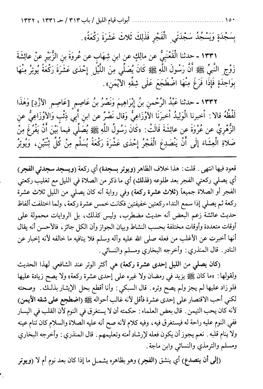 [1335] (كَانَ يُصَلِّي مِنَ اللَّيْلِ إِحْدَى عَشْرَةَ رَكْعَةً) هِيَ أَكْثَرُ الْوِتْرِ عِنْدَ الشَّافِعِيِّ لِهَذَا الحديث ولقولها ما كان يَزِيدُ فِي رَمَضَانَ وَلَا غَيْرِهِ عَلَى إِحْدَى عَشْرَةَ رَكْعَةً وَلَا يَصِحُّ زِيَادَةٌ عَلَيْهَا فَلَوْ زَادَ عَلَيْهَا لَمْ يَجُزْ وَلَمْ يَصِحَّ وِتْرُهُ