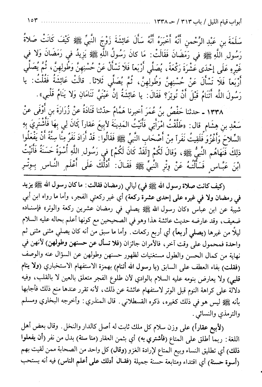 [1341] (كيف كانت صلاة رسول الله فِي) لَيَالِي (رَمَضَانَ فَقَالَتْ مَا كَانَ رَسُولُ الله يَزِيدُ فِي رَمَضَانَ وَلَا فِي غَيْرِهِ عَلَى إِحْدَى عَشْرَةَ رَكْعَةً) أَيْ غَيْرَ رَكْعَتَيِ الْفَجْرِ وأما ما رواه بن أبي شيبة عن بن عباس كان رسول الله يُصَلِّي فِي رَمَضَانَ عِشْرِينَ رَكْعَةً وَالْوِتْرَ فَإِسْنَادُهُ ضَعِيفٌ وَقَدْ عَارَضَهُ حَدِيثُ عَائِشَةَ هَذَا وَهُوَ فِي الصَّحِيحَيْنِ مَعَ كَوْنِهَا أَعْلَمُ بِحَالِهِ عَلَيْهِ السَّلَامُ لَيْلًا مِنْ غَيْرِهَا (يُصَلِّي أَرْبَعًا) أَيْ أَرْبَعَ رَكَعَاتٍ