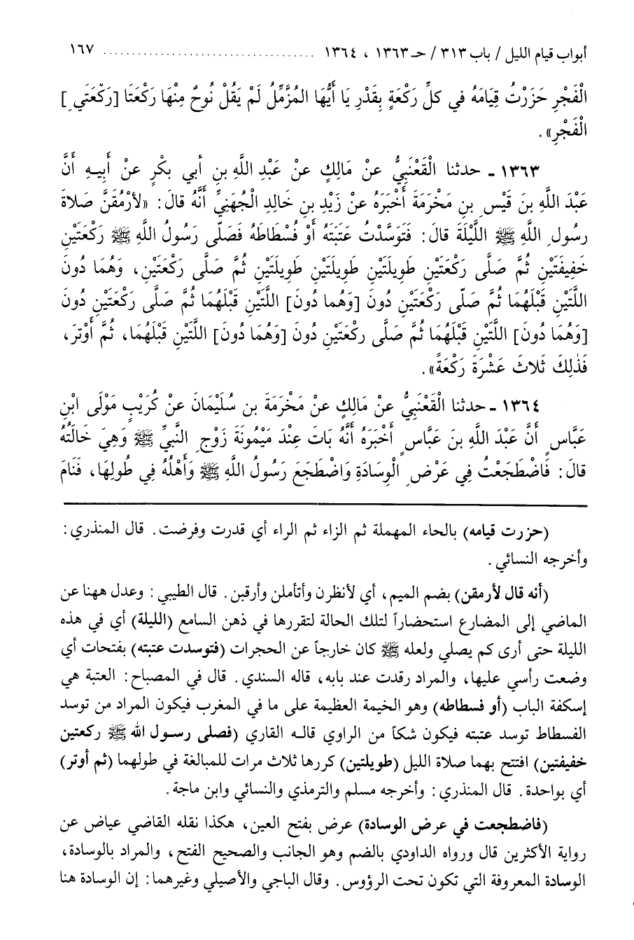 قال الطيبي وعدل ها هنا عَنِ الْمَاضِي إِلَى الْمُضَارِعِ اسْتِحْضَارًا لِتِلْكَ الْحَالَةِ لِتَقَرُّرِهَا فِي ذِهْنِ السَّامِعِ (اللَّيْلَةَ) أَيْ فِي هَذِهِ اللَّيْلَةِ حَتَّى أَرَى كَمْ يُصَلِّي وَلَعَلَّهُ كَانَ خَارِجًا عَنِ الْحُجُرَاتِ (فَتَوَسَّدْتُ عَتَبَتَهُ) بِفَتَحَاتٍ أَيْ وَضَعْتُ رَأْسِي عَلَيْهَا وَالْمُرَادُ رَقَدْتُ عِنْدَ بَابِهِ قَالَهُ السِّنْدِيُّ