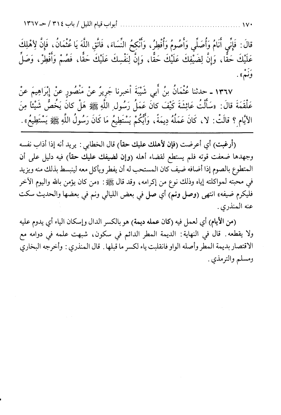 [1369] (أَرَغِبْتَ) أَيْ أَعْرَضْتَ (فَإِنَّ لِأَهْلِكَ عَلَيْكَ حَقًّا) قَالَ الْخَطَّابِيُّ يُرِيدُ أَنَّهُ إِذَا أَذَابَ نَفْسَهُ وجهدها ضعفت قوته فلم يستطع لقضاء أَهْلِهِ (وَإِنَّ لِضَيْفِكَ عَلَيْكَ حَقًّا) فِيهِ دَلِيلٌ عَلَى أَنَّ الْمُتَطَوِّعَ بِالصَّوْمِ إِذَا أَضَافَهُ ضَيْفٌ كَانَ الْمُسْتَحَبُّ لَهُ أَنْ يُفْطِرَ وَيَأْكُلَ مَعَهُ لِيَنْبَسِطَ بِذَلِكَ مِنْهُ وَيَزِيدَ فِي مَحَبَّتِهِ لِمُوَاكَلَتِهِ إِيَّاهُ وَذَلِكَ نَوْعٌ مِنْ إِكْرَامِهِ وَقَدْ قَالَ صَلَّى اللَّهُ عَلَيْهِ وَسَلَّمَ مَنْ كَانَ يُؤْمِنُ بِاللَّهِ وَالْيَوْمِ الْآخِرِ فَلْيُكْرِمْ ضَيْفَهُ انْتَهَى (وَصَلِّ وَنَمْ) أَيْ صَلِّ فِي بَعْضِ اللَّيَالِي وَنَمْ فِي بَعْضِهَا وَالْحَدِيثُ سَكَتَ عَنْهُ الْمُنْذِرِيُّ