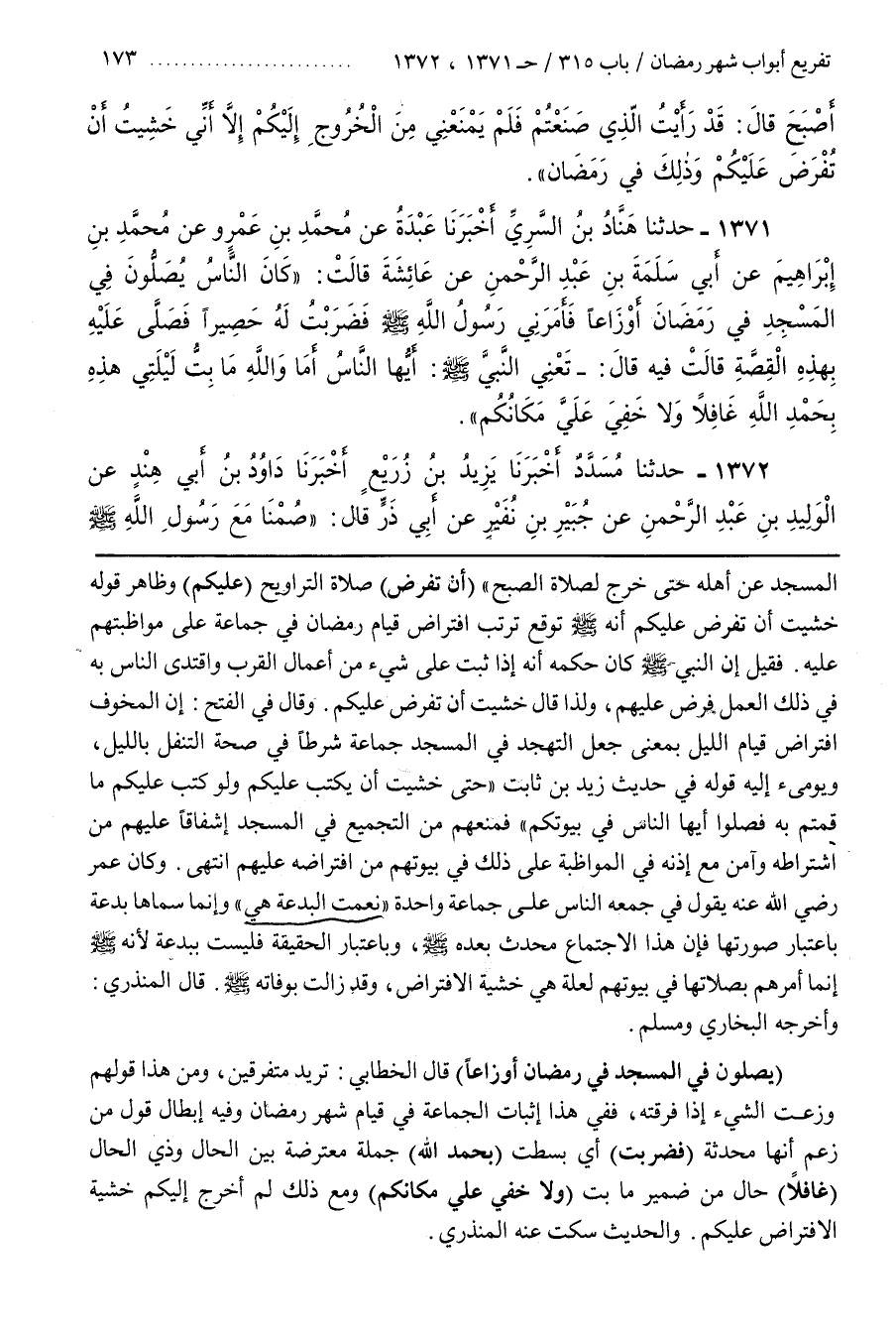 وَكَانَ عُمَرُ رَضِيَ اللَّهُ عَنْهُ يَقُولُ فِي جَمْعِهِ النَّاسَ عَلَى جَمَاعَةٍ وَاحِدَةٍ نِعْمَتِ الْبِدْعَةُ هِيَ وَإِنَّمَا سَمَّاهَا بِدْعَةً بِاعْتِبَارِ صُورَتِهَا فَإِنَّ هَذَا الِاجْتِمَاعَ مُحْدَثٌ بَعْدَهُ صَلَّى اللَّهُ عَلَيْهِ وَسَلَّمَ وَبِاعْتِبَارِ الْحَقِيقَةِ فَلَيْسَتْ بِبِدْعَةٍ لِأَنَّهُ صَلَّى اللَّهُ عَلَيْهِ وَسَلَّمَ إِنَّمَا أَمَرَهُمْ بِصَلَاتِهَا فِي بُيُوتِهِمْ لِعِلَّةٍ هِيَ خَشْيَةُ الِافْتِرَاضِ وَقَدْ زَالَتْ بِوَفَاتِهِ صَلَّى اللَّهُ عَلَيْهِ وَسَلَّمَ