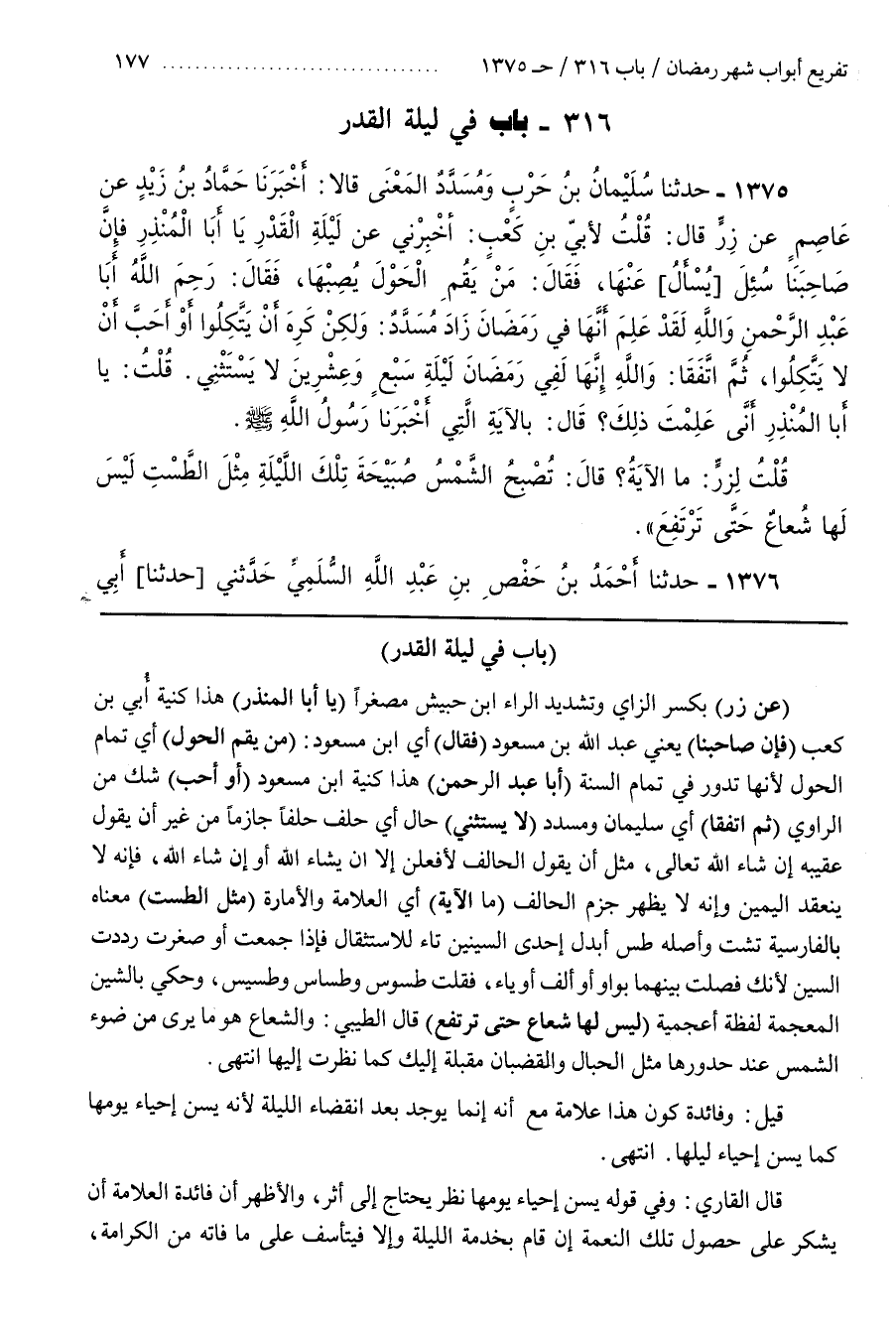 [1378] (عَنْ زِرٍّ) بِكَسْرِ الزاي وتشديد الراء بن حبيش مصغرا (ياأبا الْمُنْذِرِ) هَذَا كُنْيَةُ أُبَيِّ بْنِ كَعْبٍ (فَإِنَّ صَاحِبَنَا) يَعْنِي عَبْدَ اللَّهِ بْنَ مَسْعُودٍ (فَقَالَ) أي بن مَسْعُودٍ (مَنْ يَقُمِ الْحَوْلَ) أَيْ تَمَامَ الْحَوْلِ لِأَنَّهَا تَدُورُ فِي تَمَامِ السَّنَةِ (أَبَا عَبْدِ الرحمن) هذا كنية بن مَسْعُودٍ (أَوْ أَحَبَّ) شَكٌّ مَنِ الرَّاوِي (ثُمَّ اتَّفَقَا) أَيْ سُلَيْمَانُ وَمُسَدَّدٌ (لَا يَسْتَثْنِي) حَالٌ أَيْ حَلَفَ حَلِفًا جَازِمًا مِنْ غَيْرِ أَنْ يَقُولَ عُقَيْبَهُ إِنْ شَاءَ اللَّهُ تَعَالَى مِثْلَ أَنْ يَقُولَ الْحَالِفُ لَأَفْعَلَنَّ إِلَّا أَنْ يَشَاءَ اللَّهُ أَوْ إِنْ شَاءَ اللَّهُ فَإِنَّهُ لَا يَنْعَقِدُ الْيَمِينُ وَإِنَّهُ لَا يَظْهَرُ جَزْمُ الْحَالِفِ (مَا الْآيَةُ) أَيِ الْعَلَامَةُ وَالْأَمَارَةُ (مِثْلُ الطَّسْتِ) مَعْنَاهُ بِالْفَارِسِيَّةِ تشت وَأَصْلُهُ طَسٌّ أَبْدَلَ إِحْدَى السِّينَيْنِ تَاءً لِلِاسْتِثْقَالِ فَإِذَا جَمَعْتَ أَوْ صَغَّرْتَ رَدَدْتَ السِّينَ لِأَنَّكَ فَصَلْتَ بَيْنَهُمَا بِوَاوٍ أَوْ أَلْفٍ أَوْ يَاءٍ فَقُلْتَ طُسُوسٌ وَطِسَاسٌ وَطُسَيْسٌ وَحُكِيَ بِالشِّينِ الْمُعْجَمَةِ لَفْظَةٌ أَعْجَمِيَّةٌ (لَيْسَ لَهَا شُعَاعٌ حَتَّى تَرْتَفِعَ) قَالَ الطِّيبِيُّ وَالشُّعَاعُ هُوَ مَا يُرَى مِنْ ضَوْءِ الشَّمْسِ عِنْدَ حُدُورِهَا مثل الحبال والقضبان مقبلة إليك كما نَظَرْتَ إِلَيْهَا انْتَهَى