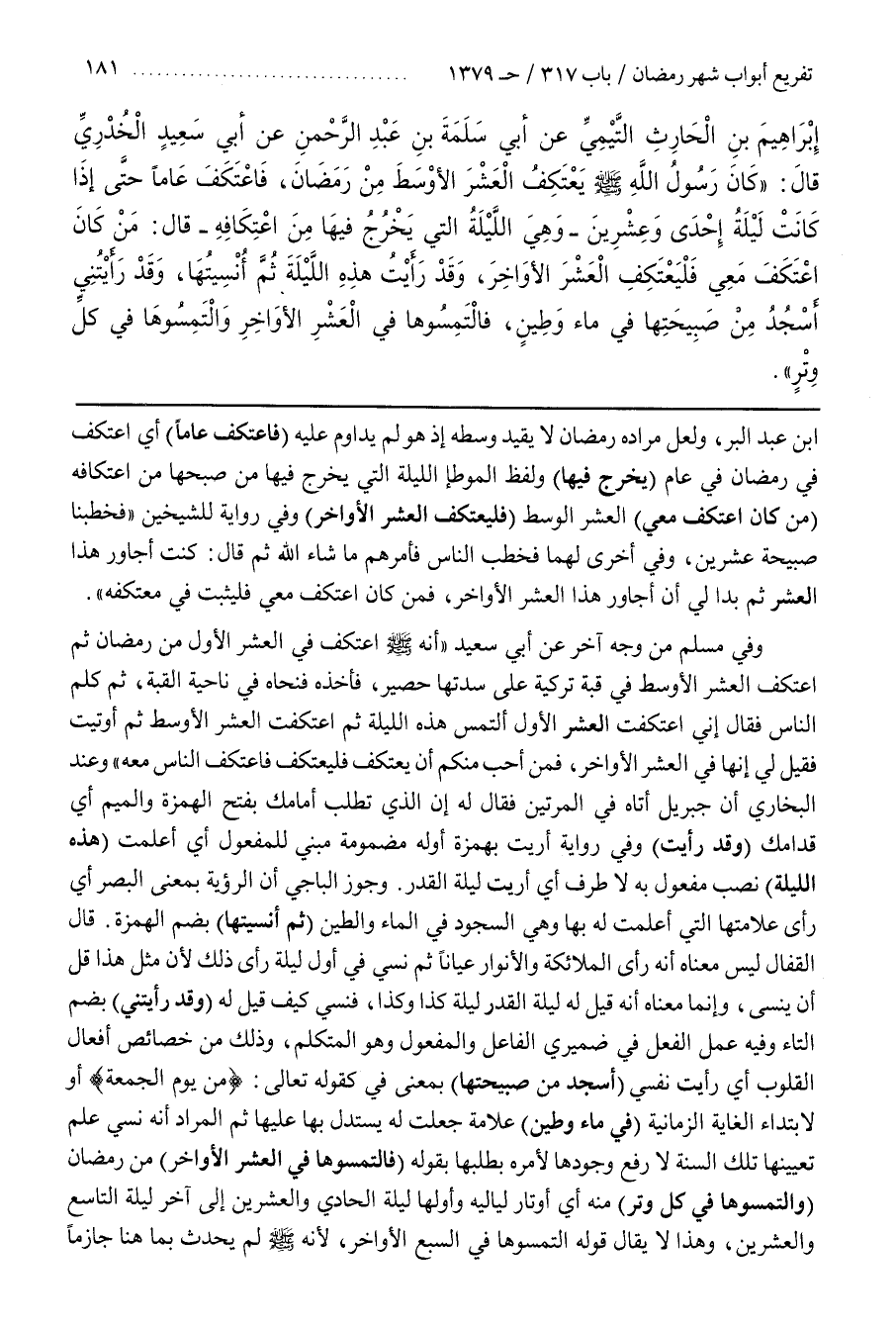 وَفِي مُسْلِمٍ مِنْ وَجْهٍ آخَرَ عَنْ أَبِي سَعِيدٍ أَنَّهُ صَلَّى اللَّهُ عَلَيْهِ وَسَلَّمَ اعْتَكَفَ فِي الْعَشْرِ الْأُوَلِ مِنْ رَمَضَانَ ثُمَّ اعْتَكَفَ الْعَشْرَ الْأَوْسَطَ فِي قُبَّةٍ تُرْكِيَّةٍ عَلَى سُدَّتِهَا حَصِيرٌ فَأَخَذَهُ فَنَحَّاهُ فِي نَاحِيَةِ الْقُبَّةِ ثُمَّ كَلَّمَ النَّاسَ فَقَالَ إِنِّي اعْتَكَفْتُ الْعَشْرَ الْأُوَلَ أَلْتَمِسُ هَذِهِ اللَّيْلَةَ ثُمَّ اعْتَكَفْتُ الْعَشْرَ الْأَوْسَطَ ثُمَّ أُوتِيتُ فَقِيلَ لِي إِنَّهَا فِي الْعَشْرِ الْأَوَاخِرِ فَمَنْ أَحَبَّ مِنْكُمْ أَنْ يَعْتَكِفَ فَلْيَعْتَكِفْ فَاعْتَكَفَ النَّاسُ مَعَهُ وَعِنْدَ الْبُخَارِيِّ أَنَّ جِبْرِيلَ أَتَاهُ فِي الْمَرَّتَيْنِ فَقَالَ لَهُ إِنِ الَّذِي تَطْلُبُ أَمَامَكَ بِفَتْحِ الْهَمْزَةِ وَالْمِيمِ أَيْ قُدَّامَكَ (وَقَدْ رَأَيْتُ) وَفِي رِوَايَةٍ أُرِيتُ بِهَمْزَةٍ أَوَّلِهِ مَضْمُومَةٍ مَبْنِيٌّ لِلْمَفْعُولِ أَيْ أُعْلِمْتُ (هَذِهِ الليلة نصب مفعول به لا طرف أَيْ أُرِيتُ لَيْلَةَ الْقَدْرِ