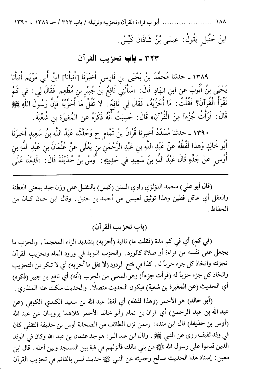 قال بن مَعِينٍ إِسْنَادُ هَذَا الْحَدِيثِ صَالِحٌ وَحَدِيثُهُ عَنِ النَّبِيِّ صَلَّى اللَّهُ عَلَيْهِ وَسَلَّمَ حَدِيثٌ لَيْسَ بِالْقَائِمِ فِي تَحْزِيبِ الْقُرْآنِ
