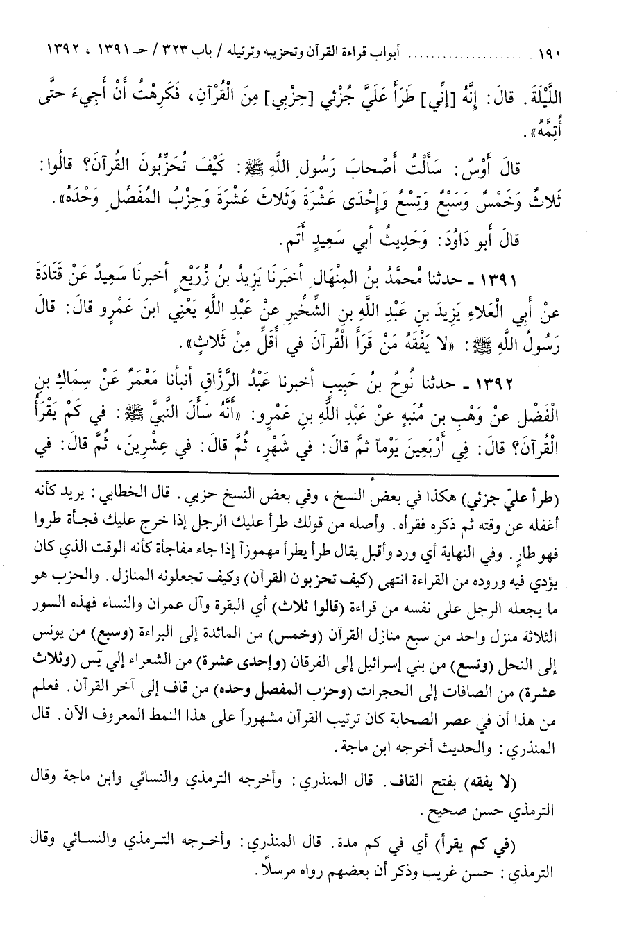 وَفِي النِّهَايَةِ أَيْ وَرَدَ وَأَقْبَلَ يُقَالُ طَرَأَ يَطْرَأُ مَهْمُوزًا إِذَا جَاءَ مُفَاجَأَةً كَأَنَّهُ فَجَأَهُ الْوَقْتُ الَّذِي كَانَ يُؤَدِّي فِيهِ وِرْدَهُ مِنَ الْقِرَاءَةِ انْتَهَى (كَيْفَ تُحَزِّبُونَ الْقُرْآنَ) وَكَيْفَ تَجْعَلُونَهُ الْمَنَازِلَ