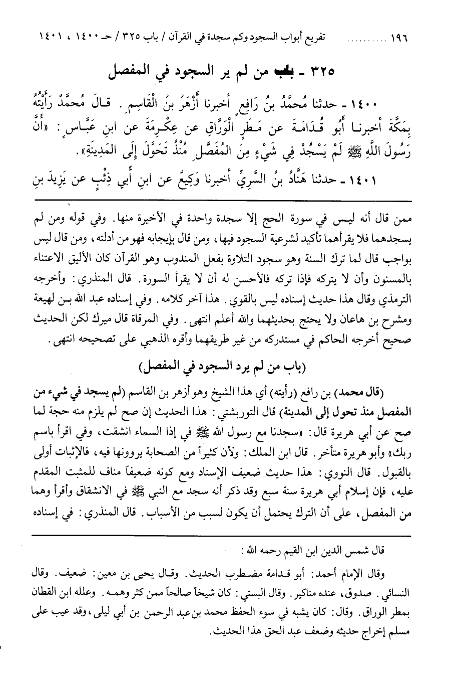 [1403] (قَالَ مُحَمَّدُ) بْنُ رَافِعٍ (رَأَيْتُهُ) أَيْ هَذَا الشَّيْخَ وَهُوَ أَزْهَرُ بْنُ الْقَاسِمِ (لَمْ يَسْجُدْ فِي شَيْءٍ مِنَ الْمُفَصَّلِ مُنْذُ تَحَوَّلَ إِلَى الْمَدِينَةِ) قَالَ التُّورْبَشْتِيُّ هَذَا الْحَدِيثُ إِنْ صَحَّ لَمْ يَلْزَمْ مِنْهُ حُجَّةٌ لِمَا صَحَّ عَنْ أَبِي هُرَيْرَةَ قَالَ سَجَدْنَا مَعَ رَسُولِ اللَّهِ صَلَّى اللَّهُ عَلَيْهِ وَسَلَّمَ في إذا السماء انشقت وفي اقرأ باسم ربك وأبو هريرة متأخر