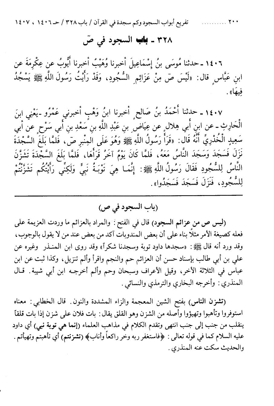[1409] (لَيْسَ ص مِنْ عَزَائِمِ السُّجُودِ) قَالَ فِي الْفَتْحِ وَالْمُرَادُ بِالْعَزَائِمِ مَا وَرَدَتِ الْعَزِيمَةُ عَلَى فِعْلِهِ كَصِيغَةِ الْأَمْرِ مَثَلًا بِنَاءً عَلَى أَنَّ بَعْضَ الْمَنْدُوبَاتِ آكَدُ مِنْ بَعْضٍ عِنْدَ مَنْ لَا يَقُولُ بِالْوُجُوبِ وَقَدْ وَرَدَ أَنَّهُ قَالَ صَلَّى اللَّهُ عَلَيْهِ وَسَلَّمَ سَجَدَهَا دَاوُدُ تَوْبَةً وَسَجَدْنَا شُكْرًا وَقَدْ روى بن الْمُنْذِرِ وَغَيْرُهُ عَنْ عَلِيِّ بْنِ أَبِي طَالِبٍ بِإِسْنَادٍ حَسَنٍ أَنَّ الْعَزَائِمَ حم وَالنَّجْمُ وَاقْرَأْ وألم تنزيل وكذا ثبت عن بن عَبَّاسٍ فِي الثَّلَاثَةِ الْأُخَرِ وَقِيلَ الْأَعْرَافُ وَسُبْحَانَ وحم وألم أخرجه بن أَبِي شَيْبَةَ
