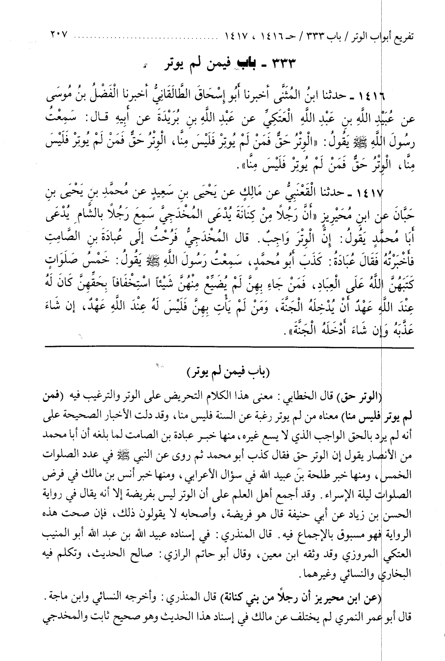 [1419] (الْوِتْرُ حَقٌّ) قَالَ الْخَطَّابِيُّ مَعْنَى هَذَا الْكَلَامِ التَّحْرِيضُ عَلَى الْوِتْرِ وَالتَّرْغِيبُ فِيهِ (فَمَنْ لَمْ يُوتِرْ فَلَيْسَ مِنَّا) مَعْنَاهُ مَنْ لَمْ يُوتِرْ رَغْبَةً عَنِ السُّنَّةِ فَلَيْسَ مِنَّا وَقَدْ دَلَّتِ الْأَخْبَارُ الصَّحِيحَةُ عَلَى أَنَّهُ لَمْ يُرِدْ بِالْحَقِّ الْوَاجِبَ الَّذِي لَا يَسَعُ غَيْرَهُ مِنْهَا خَبَرُ عُبَادَةَ بْنِ الصَّامِتِ لَمَّا بَلَغَهُ أَنَّ أَبَا مُحَمَّدٍ مِنَ الْأَنْصَارِ يَقُولُ إِنَّ الْوِتْرَ حَقٌّ فَقَالَ كَذَبَ أَبُو مُحَمَّدٍ ثُمَّ رَوَى عَنِ النَّبِيِّ صَلَّى اللَّهُ عَلَيْهِ وَسَلَّمَ فِي عَدَدِ الصَّلَوَاتِ الْخَمْسِ وَمِنْهَا خَبَرُ طَلْحَةَ بْنِ عُبَيْدِ اللَّهِ فِي سُؤَالِ الْأَعْرَابِيِّ وَمِنْهَا خَبَرُ أَنَسِ بْنِ مَالِكٍ فِي فَرْضِ الصَّلَوَاتِ لَيْلَةَ الْإِسْرَاءِ