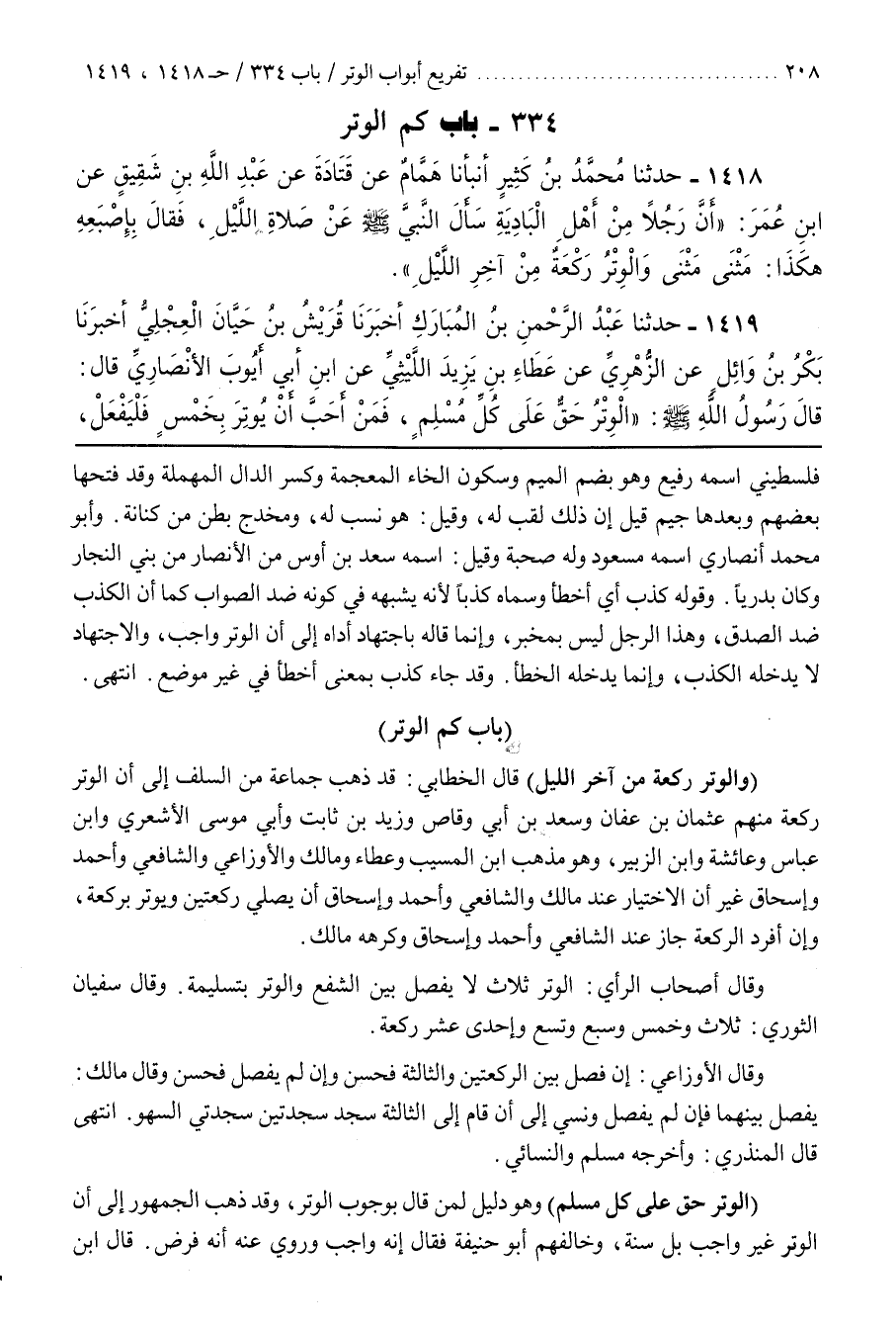 [1421] (وَالْوِتْرُ رَكْعَةٌ مِنْ آخِرِ اللَّيْلِ) قَالَ الْخَطَّابِيُّ قَدْ ذَهَبَ جَمَاعَةٌ مِنَ السَّلَفِ إِلَى أَنَّ الْوِتْرَ رَكْعَةٌ مِنْهُمْ عُثْمَانُ بْنُ عَفَانَ وَسَعْدُ بْنُ أَبِي وَقَّاصٍ وَزَيْدُ بن ثابت وأبي موسى الأشعري وبن عباس وعائشة وبن الزبير وهو مذهب بن الْمُسَيَّبِ وَعَطَاءَ وَمَالِكٍ وَالْأَوْزَاعِيِّ وَالشَّافِعِيِّ وَأَحْمَدَ وَإِسْحَاقَ غَيْرَ أَنَّ الِاخْتِيَارَ عِنْدَ مَالِكٍ وَالشَّافِعِيِّ وَأَحْمَدَ وَإِسْحَاقَ أَنْ يُصَلِّيَ رَكْعَتَيْنِ وَيُوتِرَ بِرَكْعَةٍ وَإِنْ أَفْرَدَ الرَّكْعَةَ جَازَ عِنْدَ الشَّافِعِيِّ وَأَحْمَدَ وَإِسْحَاقَ وَكَرِهَهُ مَالِكٌ
