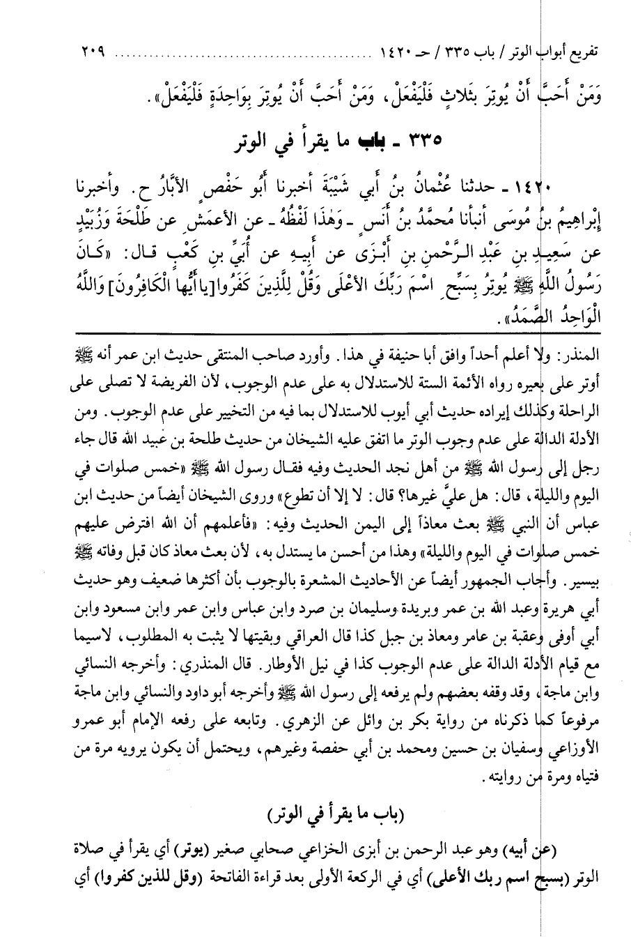 [1423] (عَنْ أَبِيهِ) وَهُوَ عَبْدُ الرَّحْمَنِ بْنُ أَبْزَى الْخُزَاعِيُّ صَحَابِيٌّ صغير (يوتر) أي يَقْرَأَ فِي صَلَاةِ الْوِتْرِ (بِسَبِّحِ اسْمِ رَبِّكَ الْأَعْلَى) أَيْ فِي الرَّكْعَةِ الْأُولَى بَعْدَ قِرَاءَةِ الفاتحة (وقل للذين كفروا) أي