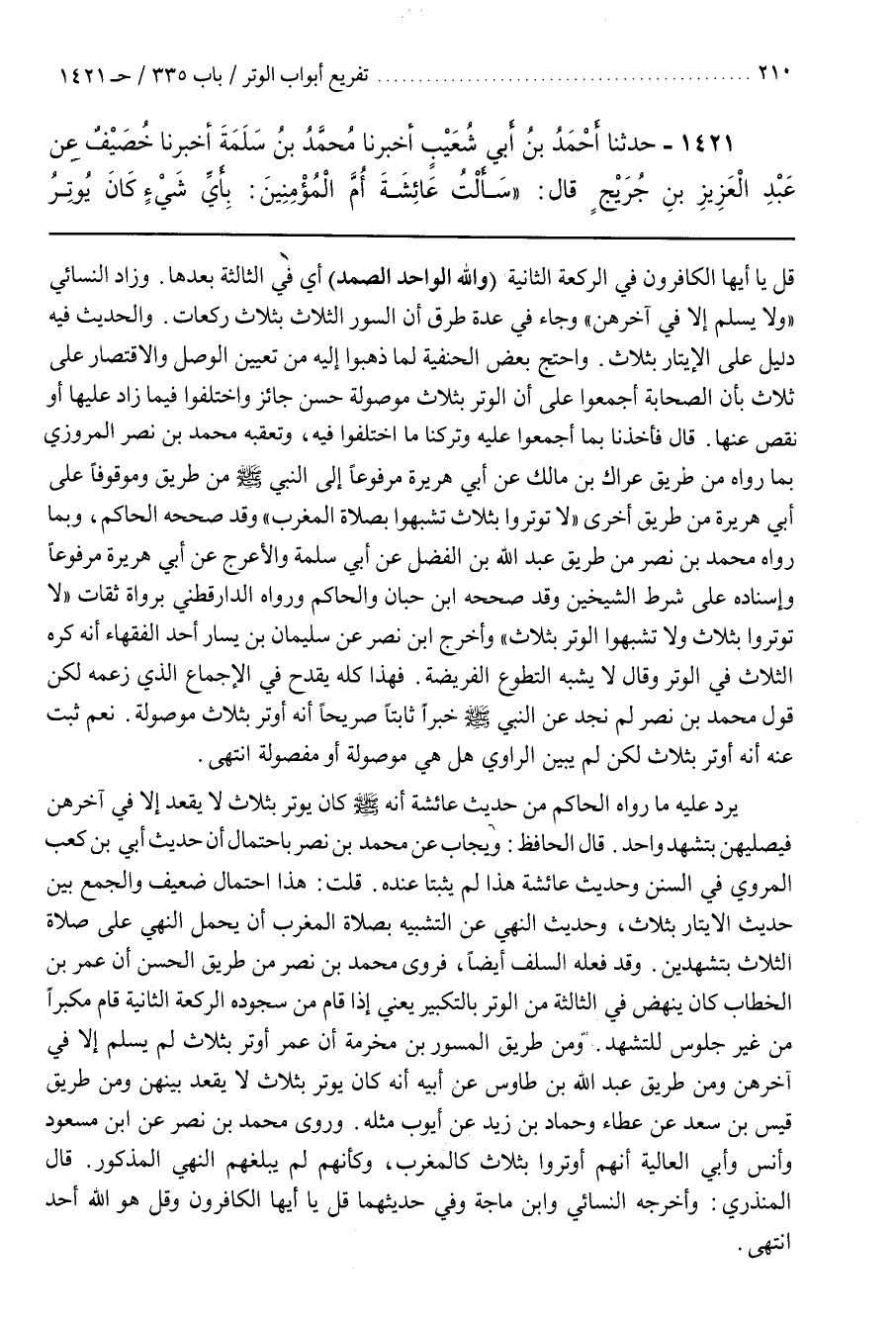 قَالَ فَأَخَذْنَا بِمَا أَجْمَعُوا عَلَيْهِ وَتَرَكْنَا مَا اخْتَلَفُوا فِيهِ وَتَعَقَّبَهُ مُحَمَّدُ بْنُ نَصْرٍ الْمَرْوَزِيُّ بِمَا رَوَاهُ مِنْ طَرِيقِ عِرَاكِ بْنِ مَالِكٍ عَنْ أَبِي هُرَيْرَةَ مَرْفُوعًا إِلَى النَّبِيِّ صَلَّى اللَّهُ عَلَيْهِ وَسَلَّمَ مِنْ طَرِيقٍ وَمَوْقُوفًا عَلَى أَبِي هُرَيْرَةَ مِنْ طَرِيقٍ أُخْرَى لَا تُوتِرُوا بِثَلَاثٍ تُشْبِهُوا بِصَلَاةِ الْمَغْرِبِ وَقَدْ صَحَّحَهُ الْحَاكِمُ وَبِمَا رَوَاهُ مُحَمَّدُ بْنُ نَصْرٍ مِنْ طَرِيقِ عَبْدِ اللَّهِ بْنِ الْفَضْلِ عَنْ أَبِي سَلَمَةَ وَالْأَعْرَجِ عَنْ أَبِي هُرَيْرَةَ مَرْفُوعًا وإسناده على شرط الشيخين وقد صححه بن حِبَّانَ وَالْحَاكِمُ وَرَوَاهُ الدَّارَقُطْنِيُّ بِرُوَاةٍ ثِقَاتٍ لَا تُوتِرُوا بِثَلَاثٍ وَلَا تُشْبِهُوا الْوِتْرَ بِثَلَاثٍ وَأَخْرَجَ بن نَصْرٍ عَنْ سُلَيْمَانَ بْنِ يَسَارٍ أَحَدِ الْفُقَهَاءِ أَنَّهُ كَرِهَ الثَّلَاثَ فِي الْوِتْرِ وَقَالَ لَا يُشْبِهُ التَّطَوُّعُ الْفَرِيضَةَ