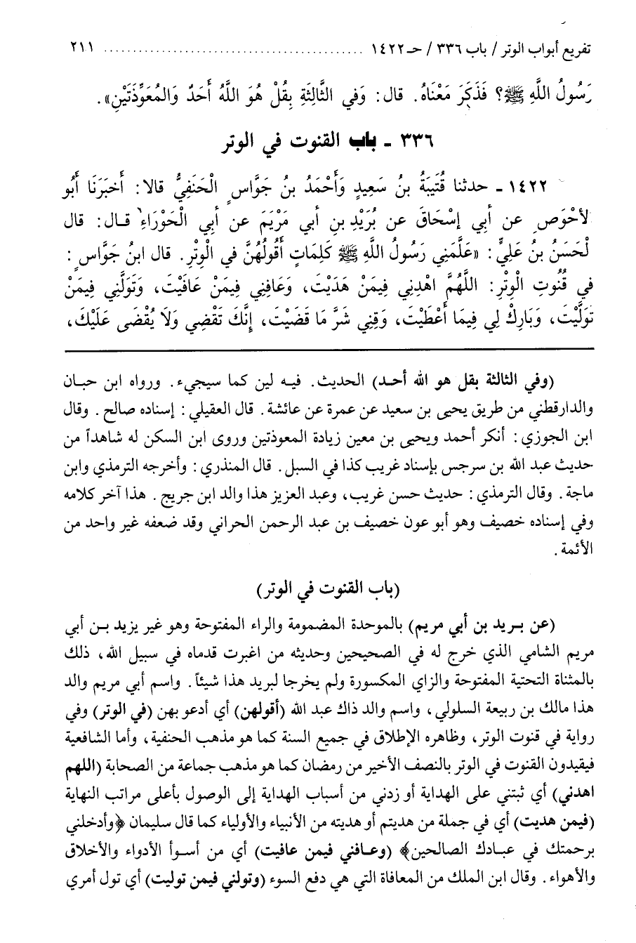 وَاسْمُ أَبِي مَرْيَمَ وَالِدُ هَذَا مَالِكُ بْنُ رَبِيعَةَ السَّلُولِيُّ وَاسْمُ وَالِدِ ذَاكَ عَبْدُ اللَّهِ (أَقُولُهُنَّ) أَيْ أَدْعُو بِهِنَّ (فِي الْوِتْرِ) وَفِي رِوَايَةٍ فِي قُنُوتِ الْوِتْرِ وَظَاهِرُهُ الْإِطْلَاقُ فِي جَمِيعِ السُّنَّةِ كَمَا هُوَ مَذْهَبُ الْحَنَفِيَّةِ وَأَمَّا الشَّافِعِيَّةُ فَيُقَيِّدُونَ الْقُنُوتَ فِي الْوِتْرِ بِالنِّصْفِ الْأَخِيرِ مِنْ رَمَضَانَ كَمَا هُوَ مَذْهَبُ جَمَاعَةٍ مِنَ الصَّحَابَةِ (اللَّهُمَّ اهْدِنِي) أَيْ ثَبِّتْنِي عَلَى الْهِدَايَةِ أَوْ زِدْنِي مِنْ أَسْبَابِ الْهِدَايَةِ إِلَى الْوُصُولِ بِأَعْلَى مَرَاتِبِ النِّهَايَةِ (فِيمَنْ هَدَيْتَ) أَيْ فِي جُمْلَةِ مَنْ هَدَيْتُمْ أَوْ هَدَيْتَهُ مِنَ الأنبياء والأولياء كما قال سيلمان وأدخلني برحمتك في عبادك الصالحين (وَعَافِنِي فِيمَنْ عَافَيْتَ) أَيْ مِنْ أَسْوَأِ الْأَدْوَاءِ والأخلاق والأهواء