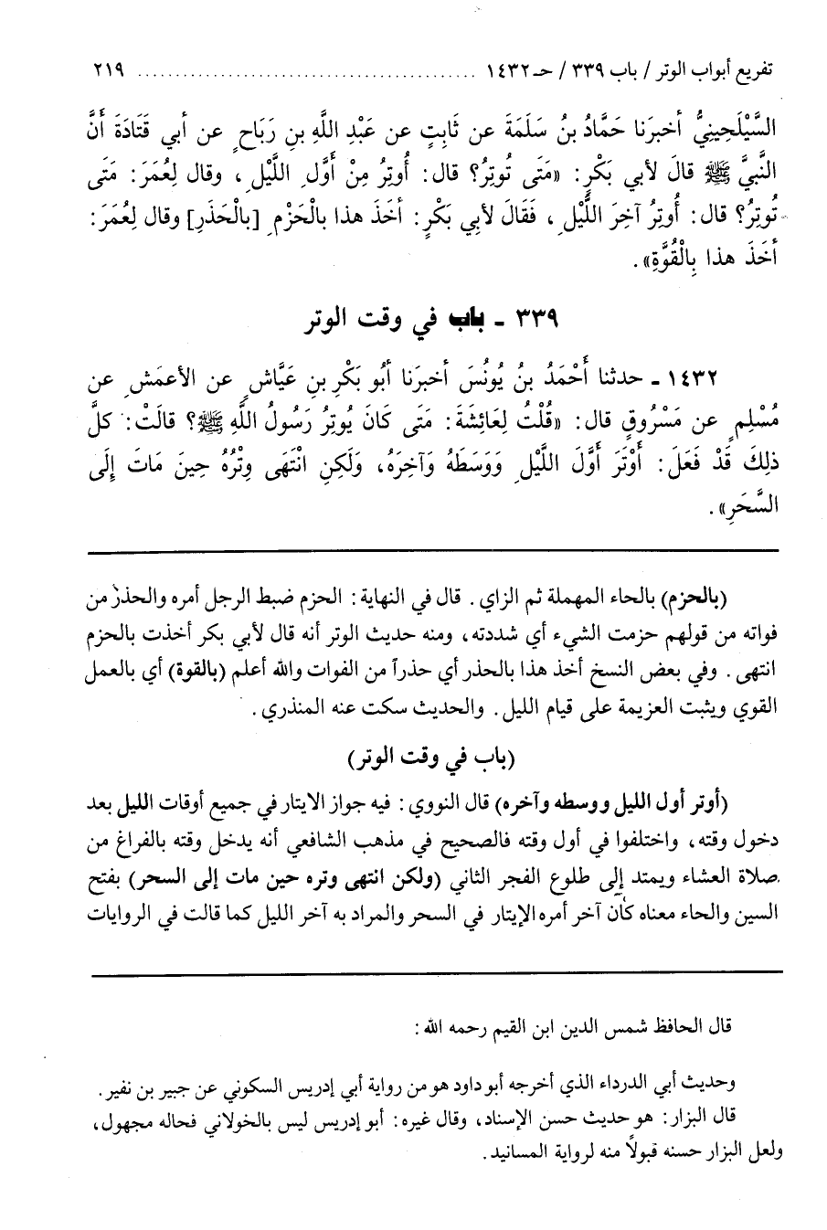 [1435] (أَوْتَرَ أَوَّلَ اللَّيْلِ وَوَسَطَهُ وَآخِرَهُ) قَالَ النَّوَوِيُّ فِيهِ جَوَازُ الْإِيتَارِ فِي جَمِيعِ أَوْقَاتِ اللَّيْلِ بَعْدَ دُخُولِ وَقْتِهِ وَاخْتَلَفُوا فِي أَوَّلِ وَقْتِهِ فَالصَّحِيحُ فِي مَذْهَبِ الشَّافِعِيِّ أَنَّهُ يَدْخُلُ وَقْتُهُ بِالْفَرَاغِ مِنْ صَلَاةِ الْعِشَاءِ وَيَمْتَدُّ إِلَى طُلُوعِ الْفَجْرِ الثَّانِي (وَلَكِنِ انْتَهَى وِتْرُهُ حِينَ مَاتَ إِلَى السَّحَرِ) بِفَتْحِ السِّينِ وَالْحَاءِ مَعْنَاهُ كَانَ آخِرَ الْإِيتَارِ فِي السَّحَرِ وَالْمُرَادُ بِهِ آخِرُ اللَّيْلِ كَمَا قَالَتْ في الروايات