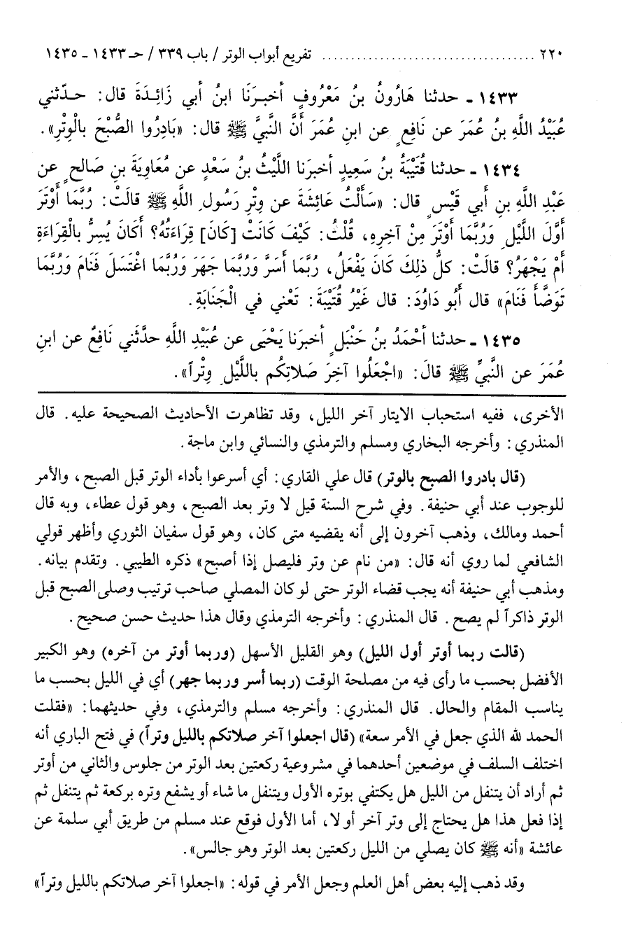 [1436] (قَالَ بَادِرُوا الصُّبْحَ بِالْوِتْرِ) قَالَ عَلِيٌّ القارىء أَيْ أَسْرِعُوا بِأَدَاءِ الْوِتْرِ قَبْلَ الصُّبْحِ وَالْأَمْرُ لِلْوُجُوبِ عِنْدَ أَبِي حَنِيفَةَ