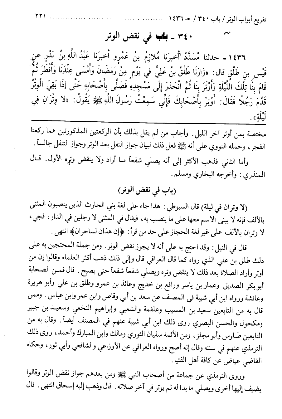 وَمَنْ جُمْلَةِ الْمُحْتَجِّينَ بِهِ عَلَى ذَلِكَ طَلْقُ بْنُ عَلِيٍّ الَّذِي رَوَاهُ كَمَا قَالَ الْعِرَاقِيُّ قَالَ وَإِلَى ذَلِكَ ذَهَبَ أَكْثَرُ الْعُلَمَاءِ وَقَالُوا إِنَّ مَنْ أَوْتَرَ وَأَرَادَ الصَّلَاةَ بَعْدَ ذَلِكَ لَا يَنْقُضُ وِتْرَهُ وَيُصَلِّي شَفْعًا حَتَّى يُصْبِحَ