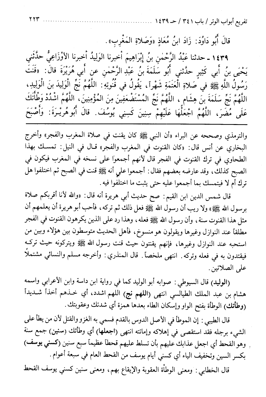 قال بن الْقَيِّمِ صَحَّ حَدِيثُ أَبِي هُرَيْرَةَ أَنَّهُ قَالَ وَاللَّهِ لَأَنَا أَقْرَبُكُمْ صَلَاةً بِرَسُولِ اللَّهِ صَلَّى اللَّهُ عَلَيْهِ وَسَلَّمَ وَلَا رَيْبَ أَنَّ رَسُولَ اللَّهِ صَلَّى اللَّهُ عَلَيْهِ وَسَلَّمَ فَعَلَ ذَلِكَ ثُمَّ تَرَكَهُ فَأَحَبَّ أَبُو هُرَيْرَةَ أَنْ يُعَلِّمَهُمْ أَنَّ مِثْلَ هَذَا الْقُنُوتِ سُنَّةٌ وَأَنَّ رَسُولَ اللَّهِ صَلَّى اللَّهُ عَلَيْهِ وَسَلَّمَ فَعَلَهُ وَهَذَا رَدٌّ عَلَى الَّذِينَ يَكْرَهُونَ الْقُنُوتَ فِي الْفَجْرِ مطلقا عند النَّوَازِلِ وَغَيْرِهَا وَيَقُولُونَ هُوَ مَنْسُوخٌ فَأَهْلُ الْحَدِيثِ مُتَوَسِّطُونَ بَيْنَ هَؤُلَاءِ وَبَيْنَ مَنِ اسْتَحَبَّهُ عِنْدَ النَّوَازِلِ وَغَيْرِهَا فَإِنَّهُمْ يَقْنُتُونَ حَيْثُ قَنَتَ رَسُولُ اللَّهِ صَلَّى اللَّهُ عَلَيْهِ وَسَلَّمَ وَيَتْرُكُونَهُ حَيْثُ تَرَكَهُ فَيَقْتَدُونَ بِهِ فِي فِعْلِهِ وَتَرْكِهِ
