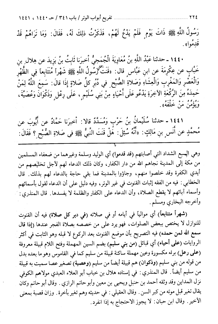 [1443] (شَهْرًا متتابعا) أي مواليا فِي أَيَّامِهِ أَوْ فِي صَلَاتِهِ (فِي دُبُرِ كُلِّ صَلَاةٍ) فِيهِ أَنَّ الْقُنُوتَ لِلنَّوَازِلِ لَا يَخْتَصُّ بِبَعْضِ الصَّلَوَاتِ فَهُوَ يَرُدُّ عَلَى مَنْ خَصَّصَهُ بِصَلَاةِ الْفَجْرِ عِنْدَهَا (إِذَا قَالَ سَمِعَ اللَّهُ لِمَنْ حَمِدَهُ) فِيهِ التَّصْرِيحُ بِأَنَّ مَوْضِعَ الْقُنُوتِ بَعْدَ الرُّكُوعِ لَا قَبْلَهُ وَهُوَ الثَّابِتُ فِي أَكْثَرِ الرِّوَايَاتِ (عَلَى أَحْيَاءَ) أَيْ قَبَائِلَ (مِنْ بَنِي سُلَيْمٍ) بِضَمِّ السِّينِ الْمُهْمَلَةِ وَفَتْحِ اللَّامِ قَبِيلَةٌ مَعْرُوفَةٌ (عَلَى رِعْلٍ) بِرَاءٍ مَكْسُورَةٍ وَعَيْنٍ مُهْمَلَةٍ سَاكِنَةٍ قَبِيلَةٌ مِنْ سُلَيْمٍ كَمَا فِي الْقَامُوسِ وَهُوَ مَا بَعْدَهُ بَدَلًا مِنْ قَوْلِهِ مِنْ بَنِي سُلَيْمٍ (وَذَكْوَانَ) هُمْ قَبِيلَةٌ أَيْضًا مِنْ سُلَيْمٍ (وَعُصَيَّةٍ) تَصْغِيرُ عَصَا سُمِّيَتْ بِهِ قَبِيلَةٌ مِنْ سُلَيْمٍ أَيْضًا