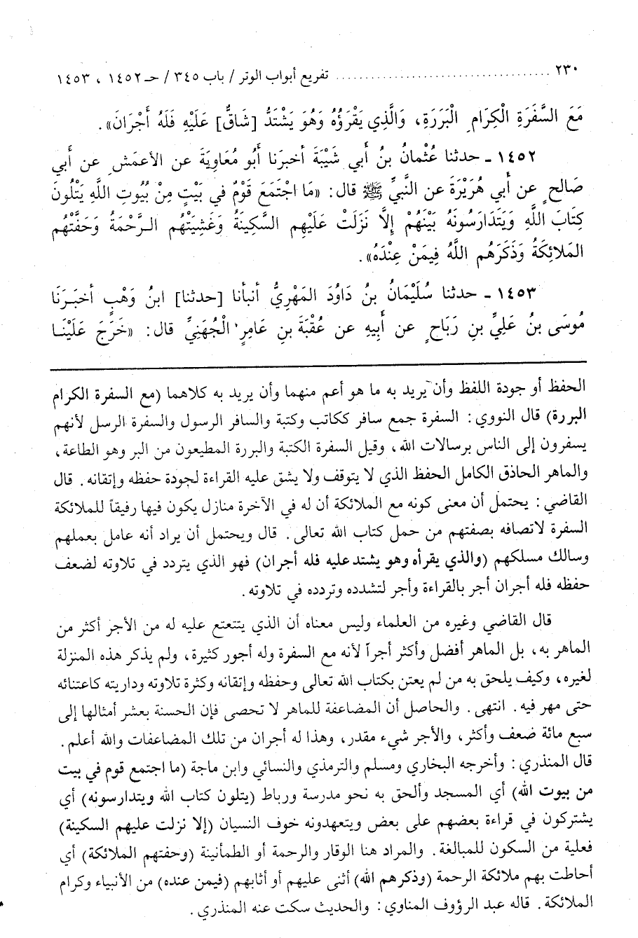 [1455] (مَا اجْتَمَعَ قَوْمٌ فِي بَيْتٍ مِنْ بُيُوتِ اللَّهِ) أَيِ الْمَسْجِدِ وَأُلْحِقَ بِهِ نَحْوُ مَدْرَسَةٍ وَرِبَاطٍ (يَتْلُونَ كِتَابَ اللَّهِ وَيَتَدَارَسُونَهُ) أَيْ يَشْتَرِكُونَ فِي قِرَاءَةِ بَعْضِهِمْ عَلَى بَعْضٍ وَيَتَعَهَّدُونَهُ خَوْفَ النِّسْيَانِ (إِلَّا نَزَلَتْ عَلَيْهِمُ السَّكِينَةُ) فَعِيلَةٌ مِنَ السُّكُونِ لِلْمُبَالَغَةِ وَالْمُرَادُ هُنَا الْوَقَارُ وَالرَّحْمَةُ أَوِ الطُّمَأْنِينَةُ (وَحَفَّتْهُمُ الْمَلَائِكَةُ) أَيْ أَحَاطَتْ بِهِمْ مَلَائِكَةُ الرَّحْمَةِ (وَذَكَرَهُمُ اللَّهُ) أَثْنَى عَلَيْهِمْ أَوْ أَثَابَهُمْ (فِيمَنْ عِنْدَهُ) مِنَ الْأَنْبِيَاءِ وَكِرَامِ الْمَلَائِكَةِ