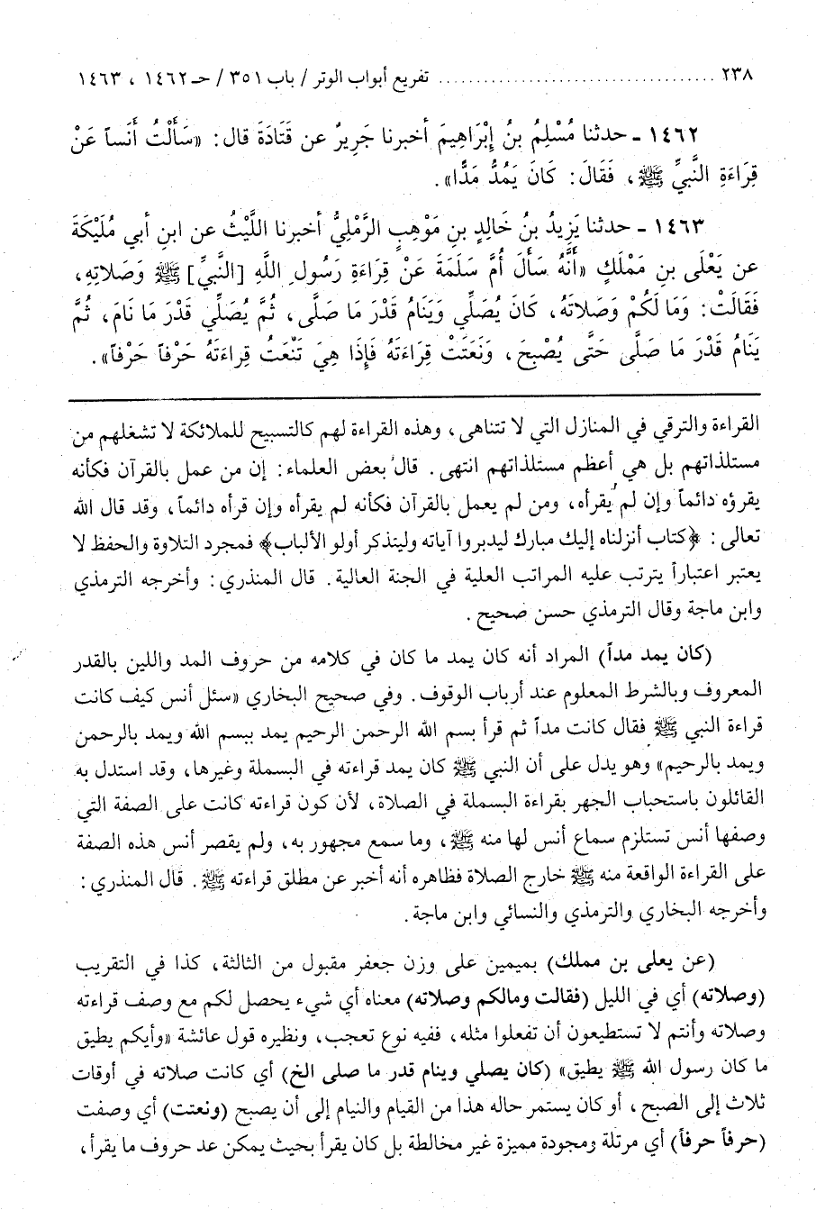 [1466] (عَنْ يَعْلَى بْنِ مَمْلَكٍ) بِمِيمَيْنِ عَلَى وَزْنِ جَعْفَرٍ مَقْبُولٌ مِنَ الثَّالِثَةِ كَذَا فِي التَّقْرِيبِ (وَصَلَاتُهُ) أَيْ فِي اللَّيْلِ (فَقَالَتْ وَمَا لَكُمْ وَصَلَاتَهُ) مَعْنَاهُ أَيُّ شَيْءٍ يَحْصُلُ لَكُمْ مَعَ وَصْفِ قِرَاءَتِهِ وَأَنْتُمْ لَا تَسْتَطِيعُونَ أَنْ تَفْعَلُوا مِثْلَهُ فَفِيهِ نَوْعُ تَعَجُّبٍ وَنَظِيرُهُ قَوْلُ عَائِشَةَ وَأَيُّكُمْ يُطِيقُ مَا كَانَ رَسُولُ اللَّهِ صَلَّى اللَّهُ عَلَيْهِ وَسَلَّمَ يُطِيقُ (كَانَ يُصَلِّي وَيَنَامُ قَدْرَ مَا صَلَّى إِلَخْ) أَيْ كَانَ صَلَاتُهُ فِي أَوْقَاتٍ ثَلَاثٍ إِلَى الصُّبْحِ أَوْ كَانَ يَسْتَمِرُّ حَالُهُ هَذَا مِنَ الْقِيَامِ وَالنِّيَامِ إِلَى أَنْ يُصْبِحَ (وَنَعَتَتْ) أَيْ وَصَفَتْ (حَرْفًا حَرْفًا) أَيْ مُرَتَّلَةً وَمُجَوَّدَةً مُمَيَّزَةً غَيْرَ مُخَالِطَةٍ بَلْ كَانَ يَقْرَأُ بِحَيْثُ يُمْكِنُ عَدُّ حُرُوفِ ما يقرأ