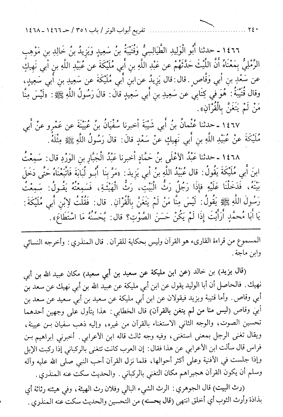 وَأَمَّا قتيبة ويزيد فيقولان عن بن أَبِي مُلَيْكَةَ عَنْ سَعِيدِ بْنِ أَبِي سَعِيدٍ عَنْ سَعْدِ بْنِ أَبِي وَقَّاصٍ (لَيْسَ مِنَّا مَنْ لَمْ يَتَغَنَّ بِالْقُرْآنِ) قَالَ الْخَطَّابِيُّ هَذَا يُتَأَوَّلُ عَلَى وَجْهَيْنِ أَحَدُهُمَا تَحْسِينُ الصَّوْتِ وَالْوَجْهُ الثَّانِي الِاسْتِغْنَاءُ بِالْقُرْآنِ مِنْ غَيْرِهِ وَإِلَيْهِ ذَهَبَ سُفْيَانُ بْنُ عُيَيْنَةَ وَيُقَالُ تَغَنَّى الرَّجُلُ بِمَعْنَى استغنى وفيه وجه ثالث قاله بن الْأَعْرَابِيِّ