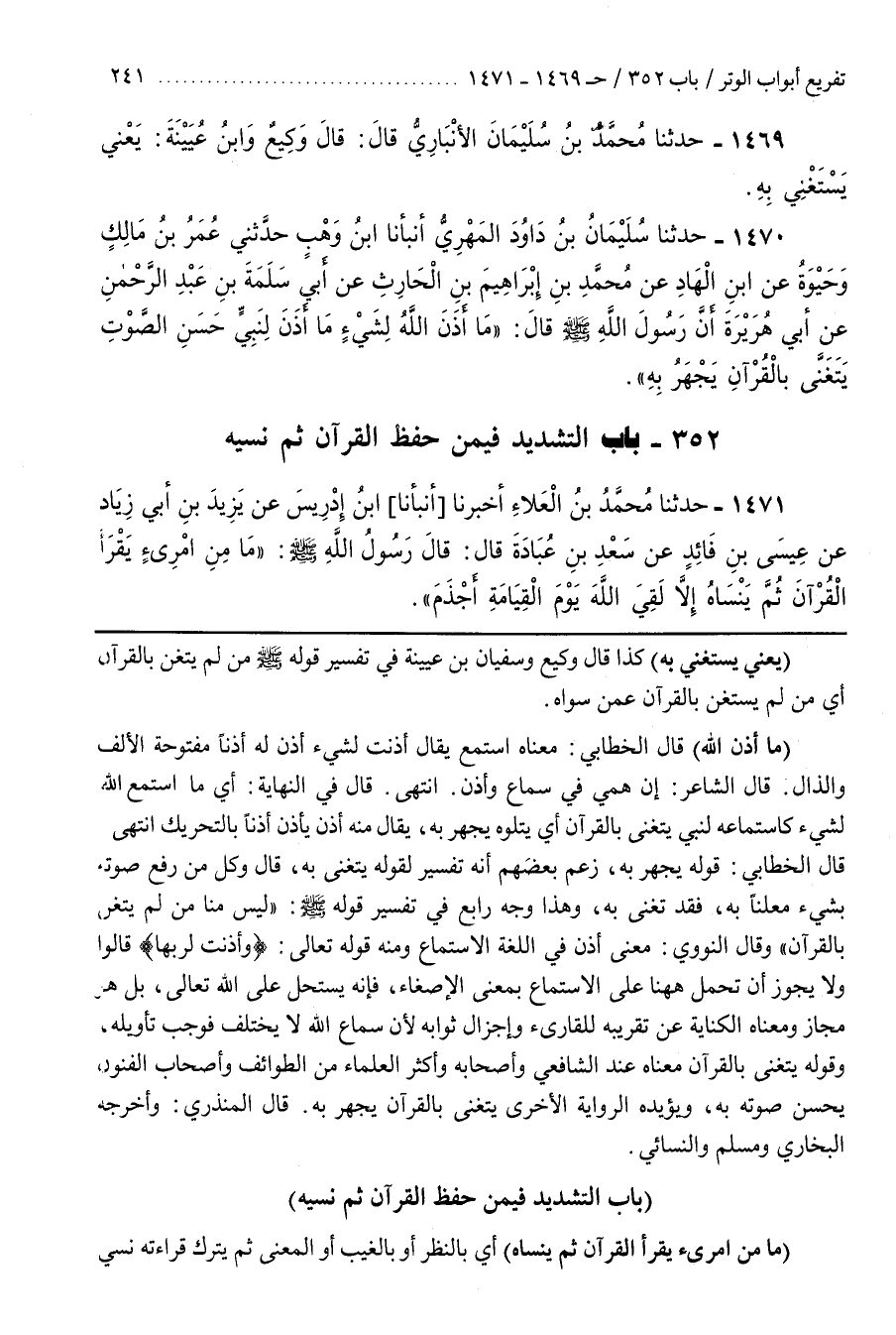 [1472] (يَعْنِي يَسْتَغْنِي بِهِ) كَذَا قَالَ وَكِيعٌ وَسُفْيَانُ بْنُ عُيَيْنَةَ فِي تَفْسِيرِ قَوْلِهِ صَلَّى اللَّهُ عَلَيْهِ وَسَلَّمَ مَنْ لَمْ يَتَغَنَّ بِالْقُرْآنِ أَيْ مَنْ لَمْ يَسْتَغْنَ بِالْقُرْآنِ عَمَّنْ سِوَاهُ