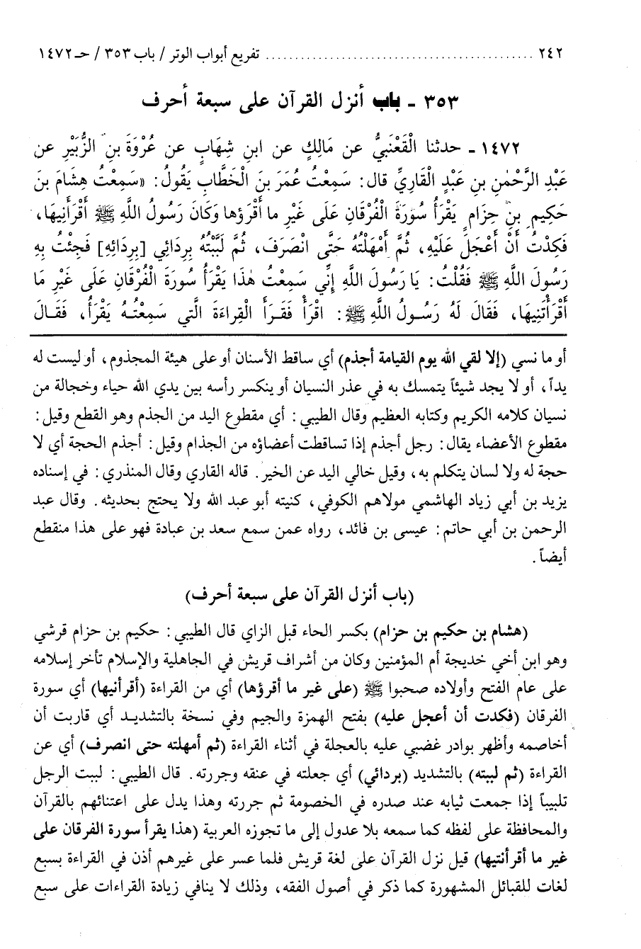 [1475] (هُشَامُ بْنُ حَكِيمِ بْنِ حِزَامٍ) بِكَسْرِ الْحَاءِ قَبْلَ الزَّايِ قَالَ الطِّيبِيُّ حَكِيمُ بن حزام قرشي وهو بن أَخِي خَدِيجَةَ أُمِّ الْمُؤْمِنِينَ وَكَانَ مِنْ أَشْرَافِ قُرَيْشٍ فِي الْجَاهِلِيَّةِ وَالْإِسْلَامِ تَأَخَّرَ إِسْلَامُهُ إِلَى عَامِ الْفَتْحِ وَأَوْلَادُهُ صَحِبُوا النَّبِيَّ صَلَّى اللَّهُ عَلَيْهِ وَسَلَّمَ (عَلَى غَيْرِ مَا أَقْرَؤُهَا) أَيْ مِنَ الْقِرَاءَةِ (أَقْرَأَنِيهَا) أَيْ سُورَةَ الْفُرْقَانِ (فَكِدْتُ أَنْ أَعْجَلَ عَلَيْهِ) بِفَتْحِ الْهَمْزَةِ وَالْجِيمِ وَفِي نُسْخَةٍ بِالتَّشْدِيدِ أَيْ قَارَبْتُ أَنْ أُخَاصِمَهُ وَأُظْهِرَ بَوَادِرَ غَضَبِي عَلَيْهِ بِالْعَجَلَةِ فِي أَثْنَاءِ الْقِرَاءَةِ (ثُمَّ أَمْهَلْتُهُ حَتَّى انْصَرَفَ) أَيْ عَنِ الْقِرَاءَةِ (ثُمَّ لَبَّبْتُهُ) بِالتَّشْدِيدِ (بِرِدَائِي) أَيْ جَعَلْتُهُ فِي عُنُقِهِ وَجَرَرْتُهُ