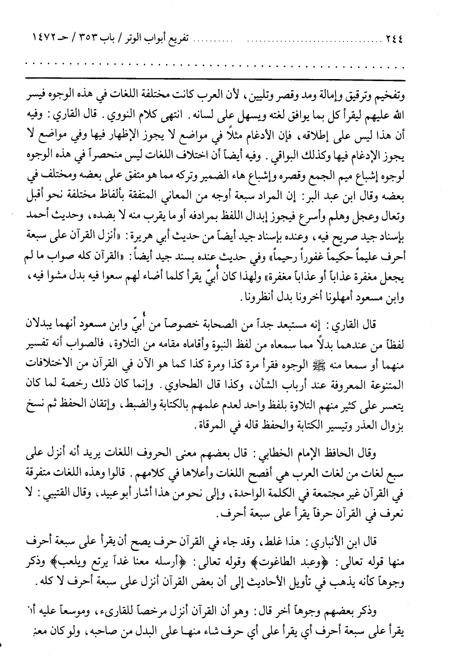 وَفِيهِ أَيْضًا أَنَّ اخْتِلَافَ اللُّغَاتِ لَيْسَ مُنْحَصِرًا فِي هَذِهِ الْوُجُوهِ لِوُجُوهِ إِشْبَاعِ مِيمِ الْجَمْعِ وَقَصْرِهِ وَإِشْبَاعِ هَاءِ الضَّمِيرِ وَتَرْكِهِ مِمَّا هُوَ مُتَّفِقٌ عَلَى بَعْضِهِ وَمُخْتَلِفٌ فِي بعضه وقال بن عَبْدِ الْبَرِّ إِنَّ الْمُرَادَ سَبْعَةُ أَوْجُهٍ مِنَ الْمَعَانِي الْمُتَّفِقَةِ بِأَلْفَاظٍ مُخْتَلِفَةٍ نَحْوِ أَقْبِلْ وَتَعَالَ وَعَجِّلْ وَهَلُمَّ وَأَسْرِعْ فَيَجُوزُ إِبْدَالُ اللَّفْظِ بِمُرَادِفِهِ أَوْ مَا يَقْرُبُ مِنْهُ لَا بِضِدِّهِ وَحَدِيثُ أَحْمَدَ بِإِسْنَادٍ جَيِّدٍ صَرِيحٍ فِيهِ وَعِنْدَهُ بِإِسْنَادٍ جَيِّدٍ أَيْضًا مِنْ حَدِيثِ أَبِي هُرَيْرَةَ أُنْزِلَ الْقُرْآنُ عَلَى سَبْعَةِ أَحْرُفٍ عَلِيمًا حَكِيمًا غَفُورًا رَحِيمًا وَفِي حَدِيثٍ عِنْدَهُ بِسَنَدٍ جَيِّدٍ أَيْضًا الْقُرْآنُ كُلُّهُ صَوَابٌ مَا لَمْ يَجْعَلْ مَغْفِرَةً عَذَابًا أَوْ عَذَابًا مَغْفِرَةً وَلِهَذَا كَانَ أُبَيٌّ يَقْرَأُ كُلَّمَا أَضَاءَ لَهُمْ سَعَوْا فِيهِ بَدَلَ مشوا فيه وبن مسعود أمهلونا أخرونا بدل أنظرونا