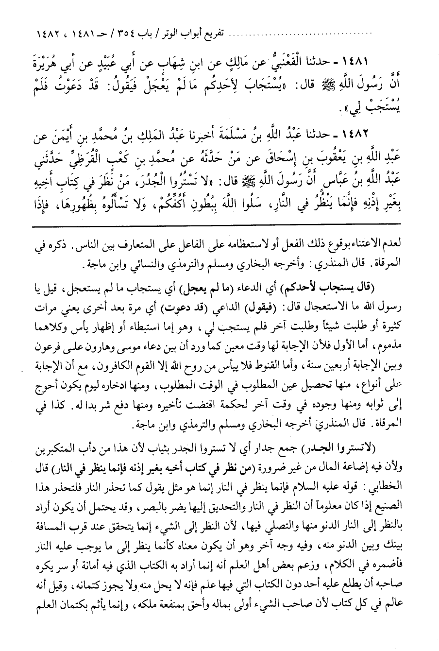 [1485] (لَا تَسْتُرُوا الْجُدُرَ) جَمْعُ جِدَارٍ أَيْ لَا تَسْتُرُوا الْجُدُرَ بِثِيَابٍ لِأَنَّ هَذَا مِنْ دَأْبِ الْمُتَكَبِّرِينَ وَلِأَنَّ فِيهِ إِضَاعَةَ الْمَالِ مِنْ غَيْرِ ضَرُورَةٍ (مَنْ نَظَرَ فِي كِتَابِ أَخِيهِ بِغَيْرِ إِذْنِهِ فَإِنَّمَا يَنْظُرُ فِي النَّارِ) قَالَ الخطابي قوله عليه السلام فَإِنَّمَا يَنْظُرُ فِي النَّارِ إِنَّمَا هُوَ مَثَلٌ يَقُولُ كَمَا تَحْذَرُ النَّارَ فَلْتَحْذَرْ هَذَا الصَّنِيعَ إِذَا كَانَ مَعْلُومًا أَنَّ النَّظَرَ فِي النَّارِ والتحديق إليها يضر البصر وقد يحتمل أَنْ يَكُونَ أَرَادَ بِالنَّظَرِ إِلَى النَّارِ الدُّنُوَّ مِنْهَا وَالتَّصَلِّي فِيهَا لِأَنَّ النَّظَرَ إِلَى الشَّيْءِ إِنَّمَا يَتَحَقَّقُ عِنْدَ قُرْبِ الْمَسَافَةِ بَيْنَكَ وَبَيْنَ الدُّنُوِّ مِنْهُ وَفِيهِ وَجْهٌ آخَرُ وَهُوَ أَنْ يكون معناه كأنما ينظر إِلَى مَا يُوجِبُ عَلَيْهِ النَّارَ فَأَضْمَرَهُ فِي الْكَلَامِ وَزَعَمَ بَعْضُ أَهْلِ الْعِلْمِ أَنَّهُ إِنَّمَا أَرَادَ بِهِ الْكِتَابَ الَّذِي فِيهِ أَمَانَةٌ أَوْ سِرٌّ يَكْرَهُ صَاحِبُهُ أَنْ يَطَّلِعَ عَلَيْهِ أَحَدٌ دُونَ الْكِتَابِ الَّتِي فِيهَا عِلْمٌ فَإِنَّهُ لَا يَحِلُّ مِنْهُ وَلَا يَجُوزُ كِتْمَانُهُ وَقِيلَ إِنَّهُ عَالِمٌ فِي كُلِّ كِتَابٍ لِأَنَّ صَاحِبَ الشَّيْءِ أَوْلَى بِمَالِهِ وَأَحَقُّ بِمَنْفَعَةِ مِلْكِهِ وَإِنَّمَا يَأْثَمُ بكتمان العلم