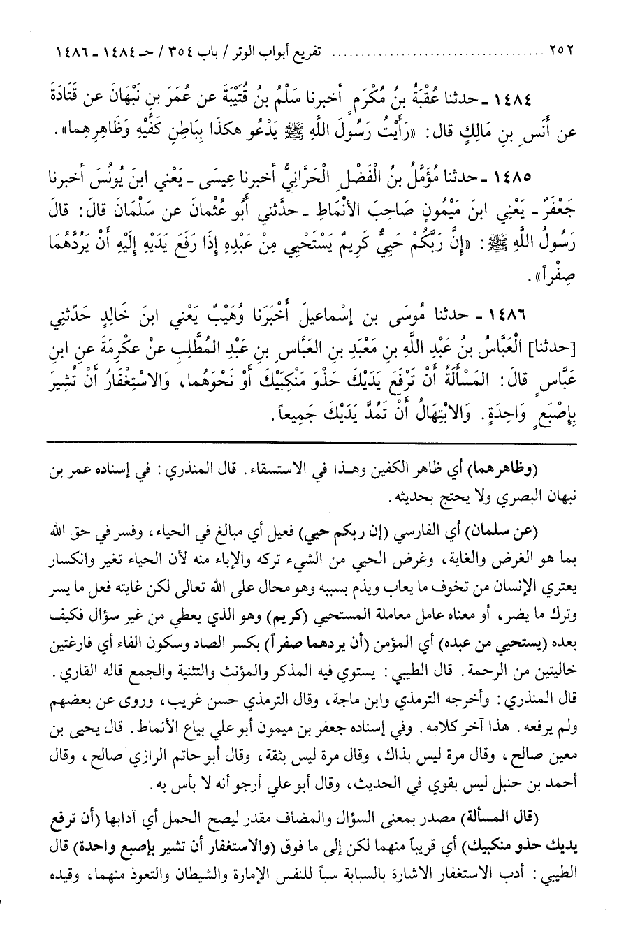 [1488] (عَنْ سَلْمَانَ) أَيِ الْفَارِسِيِّ (إِنَّ رَبَّكُمْ حَيِيٌّ) فَعِيلٌ أَيْ مُبَالِغٌ فِي الْحَيَاءِ وَفَسَّرَ فِي حَقِّ اللَّهِ بِمَا هُوَ الْغَرَضُ وَالْغَايَةُ وَغَرَضُ الْحَيِيِّ مِنَ الشَّيْءِ تَرْكُهُ وَالْإِبَاءُ مِنْهُ لِأَنَّ الْحَيَاءَ تَغَيُّرٌ وَانْكِسَارٌ يَعْتَرِي الْإِنْسَانُ مِنْ تَخَوُّفِ مَا يُعَابُ وَيُذَمُّ بِسَبَبِهِ وَهُوَ مُحَالٌ عَلَى اللَّهِ تَعَالَى لَكِنَّ غَايَتَهُ فِعْلُ مَا يَسُرُّ وَتَرْكُ مَا يَضُرُّ أَوْ مَعْنَاهُ عَامَلَ مُعَامَلَةَ الْمُسْتَحْيِي (كَرِيمٌ) وَهُوَ الَّذِي يُعْطِي مِنْ غَيْرِ سُؤَالٍ فَكَيْفَ بَعْدَهُ (يَسْتَحْيِي مِنْ عَبْدِهِ) أَيِ الْمُؤْمِنِ (أَنْ يَرُدَّهُمَا صِفْرًا) بِكَسْرِ الصَّادِ وَسُكُونِ الْفَاءِ أَيْ فَارِغَتَيْنِ خَالِيَتَيْنِ مِنَ الرَّحْمَةِ