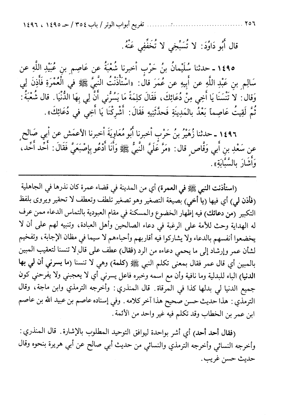 [1498] (استأذنت النبي فِي الْعُمْرَةِ) أَيْ مِنَ الْمَدِينَةِ فِي قَضَاءِ عُمْرَةٍ كَانَ نَذَرَهَا فِي الْجَاهِلِيَّةِ (فَأَذِنَ لِي) أي فيها (ياأخي) بِصِيغَةِ التَّصْغِيرِ وَهُوَ تَصْغِيرُ تَلَطُّفٍ وَتَعَطُّفٍ لَا تَحْقِيرٍ وَيُرْوَى بِلَفْظِ التَّكْبِيرِ (مِنْ دُعَائِكِ) فِيهِ إِظْهَارُ الْخُضُوعِ وَالْمَسْكَنَةِ فِي مَقَامِ الْعُبُودِيَّةِ بِالْتِمَاسِ الدُّعَاءِ مِمَّنْ عُرِفَ لَهُ الْهِدَايَةُ وَحَثٌّ لِلْأُمَّةِ عَلَى الرَّغْبَةِ فِي دُعَاءِ الصَّالِحِينَ وَأَهْلِ الْعِبَادَةِ وَتَنْبِيهٌ لَهُمْ عَلَى أَنْ لَا يُخْضِعُوا أَنْفُسَهُمْ بِالدُّعَاءِ وَلَا يُشَارِكُوا فِيهِ أَقَارِبَهُمْ وَأَحِبَّاءَهُمْ لَا سِيَّمَا فِي مَظَانِّ الْإِجَابَةِ وَتَفْخِيمٌ لِشَأْنِ عُمَرَ وَإِرْشَادٌ إِلَى مَا يَحْمِي دُعَاءَهُ مِنَ الرَّدِّ (فَقَالَ) عَطْفٌ عَلَى قَالَ لَا تَنْسَنَا لِتَعْقِيبِ الْمُبَيَّنِ بِالْمُبَيِّنِ أَيْ قَالَ عُمَرُ فَقَالَ بِمَعْنَى تكلم النبي (كَلِمَةً) وَهِيَ لَا تَنْسَنَا (مَا يَسُرُّنِي أَنَّ لِي بِهَا الدُّنْيَا) الْبَاءُ لِلْبَدَلِيَّةِ وَمَا نَافِيَةٌ وَأَنَّ مَعَ اسْمِهِ وَخَبَرِهِ فَاعِلُ يَسُرُّنِي أَيْ لايعجبني وَلَا يُفْرِحُنِي كَوْنُ جَمِيعِ الدُّنْيَا لِي بَدَلَهَا كَذَا فِي الْمِرْقَاةِ