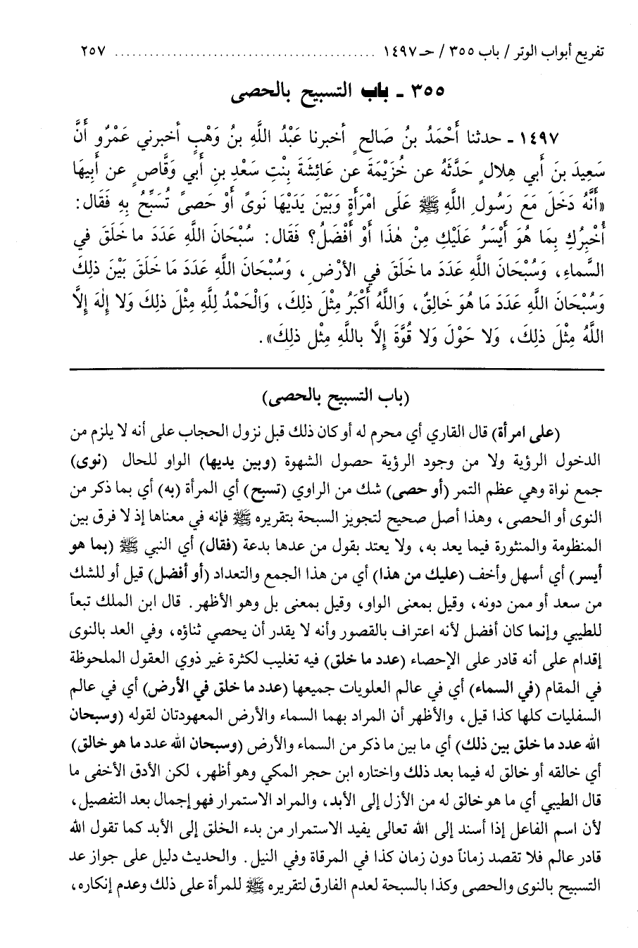 [1500] (على امرأة) قال القارىء أَيْ مَحْرَمٍ لَهُ أَوْ كَانَ ذَلِكَ قَبْلَ نُزُولِ الْحِجَابِ عَلَى أَنَّهُ لَا يَلْزَمُ مِنَ الدُّخُولِ الرُّؤْيَةُ وَلَا مِنْ وُجُودِ الرُّؤْيَةِ حُصُولُ الشَّهْوَةِ (وَبَيْنَ يَدَيْهَا) الْوَاوُ لِلْحَالِ (نَوًى) جَمْعُ نَوَاةٍ وَهِيَ عَظْمُ التَّمْرِ (أَوْ حَصًى) شَكٌّ مِنَ الرَّاوِي (تُسَبِّحُ) أَيِ الْمَرْأَةُ (بِهِ) أَيْ بِمَا ذَكَرَ مِنَ النَّوَى أَوِ الْحَصَى وَهَذَا أَصْلٌ صَحِيحٌ لِتَجْوِيزِ السُّبْحَةِ بِتَقْرِيرِهِ صَلَّى اللَّهُ عَلَيْهِ وَسَلَّمَ فَإِنَّهُ فِي مَعْنَاهَا إِذْ لَا فرق بين المنظومة والمنثورة فيما بعد بِهِ وَلَا يُعْتَدُّ بِقَوْلِ مَنْ عَدَّهَا بِدْعَةً (فَقَالَ) أَيِ النَّبِيُّ صَلَّى اللَّهُ عَلَيْهِ وَسَلَّمَ (بِمَا هُوَ أَيْسَرُ) أَيْ أَسْهَلُ وَأَخَفُّ (عَلَيْكِ مِنْ هَذَا) أَيْ مِنْ هَذَا الْجَمْعِ وَالتَّعْدَادِ (أَوْ أَفْضَلُ) قِيلَ أَوْ لِلشَّكِّ مِنْ سَعْدٍ أَوْ مِمَّنْ دُونَهُ وَقِيلَ بِمَعْنَى الْوَاوِ وَقِيلَ بمعنى بل وهو الأظهر