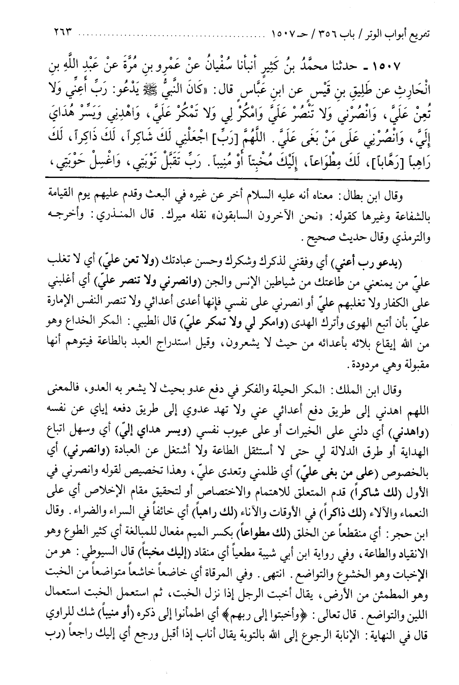 [1510] (يَدْعُو رَبِّ أَعِنِّي) أَيْ وَفِّقْنِي لِذِكْرِكَ وَشُكْرِكَ وَحُسْنِ عِبَادَتِكَ (وَلَا تُعِنْ عَلَيَّ) أَيْ لَا تُغَلِّبْ عَلَيَّ مَنْ يَمْنَعُنِي مِنْ طَاعَتِكَ مِنْ شَيَاطِينِ الْإِنْسِ وَالْجِنِّ (وَانْصُرْنِي وَلَا تَنْصُرْ عَلَيَّ) أَيْ أَغْلِبْنِي عَلَى الْكُفَّارِ وَلَا تُغَلِّبْهُمْ عَلَيَّ أَوِ انْصُرْنِي عَلَى نَفْسِي فَإِنَّهَا أَعْدَى أَعْدَائِي وَلَا تَنْصُرِ النَّفْسَ الْأَمَارَةَ عَلَيَّ بِأَنْ أَتَّبِعَ الْهَوَى وَأَتْرُكَ الْهُدَى (وَامْكُرْ لِي وَلَا تَمْكُرْ عَلَيَّ) قَالَ الطِّيبِيُّ الْمَكْرُ الْخِدَاعُ وَهُوَ مِنَ اللَّهِ إِيقَاعُ بَلَائِهِ بِأَعْدَائِهِ مِنْ حَيْثُ لَا يَشْعُرُونَ وَقِيلَ اسْتِدْرَاجُ الْعَبْدِ بِالطَّاعَةِ فَيَتَوَهَّمُ أنها مقبولة وهي مردودة
