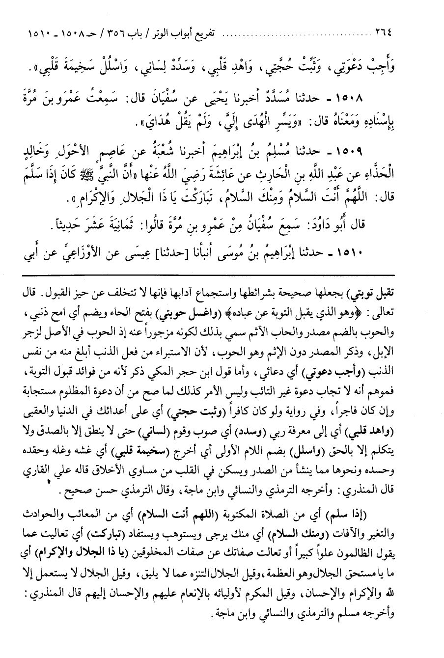 قَالَ تَعَالَى وَهُوَ الَّذِي يَقْبَلُ التَّوْبَةَ عَنْ عِبَادِهِ (وَاغْسِلْ حَوْبَتِي) بِفَتْحِ الْحَاءِ وَيُضَمُّ أَيِ امْحُ ذَنْبِي وَالْحُوبُ بِالضَّمِّ مَصْدَرٌ وَالْحَابُ الْإِثْمُ سُمِّيَ بذلك لكونه مزجورا عنه لحوب فِي الْأَصْلِ لِزَجْرِ الْإِبِلِ وَذَكَرَ الْمَصْدَرَ دُونَ الإثم وهو إذالحوب لِأَنَّ الِاسْتِبْرَاءَ مِنْ فِعْلِ الذَّنْبِ أَبْلَغُ مِنْهُ مِنْ نَفْسِ الذَّنْبِ (وَأَجِبْ دَعْوَتِي) أَيْ دُعَائِي وأما قول بن حَجَرٍ الْمَكِّيِّ ذُكِرَ لِأَنَّهُ مِنْ فَوَائِدِ قَبُولِ التَّوْبَةِ فَمُوهِمٌ أَنَّهُ لَا تُجَابُ دَعْوَةُ غَيْرِ التَّائِبِ وَلَيْسَ الْأَمْرُ كَذَلِكَ لِمَا صَحَّ مِنْ أَنَّ دَعْوَةَ الْمَظْلُومِ مُسْتَجَابَةٌ وَإِنْ كَانَ فَاجِرًا وَفِي رِوَايَةٍ وَلَوْ كَانَ كَافِرًا (وَثَبِّتْ حُجَّتِي) أَيْ عَلَى أَعْدَائِكَ فِي الدُّنْيَا وَالْعُقْبَى (وَاهْدِ قَلْبِي) أَيْ إِلَى مَعْرِفَةِ رَبِّي (وَسَدِّدْ) أَيْ صَوِّبْ وَقَوِّمْ (لِسَانِي) حَتَّى لَا يَنْطِقَ إِلَّا بِالصِّدْقِ وَلَا يَتَكَلَّمَ إِلَّا بِالْحَقِّ (وَاسْلُلْ) بِضَمِّ اللَّامِ الْأُولَى أَيْ أَخْرِجْ (سَخِيمَةَ قَلْبِي) أَيْ غِشَّهُ وَغِلَّهُ وَحِقْدَهُ وَحَسَدَهُ وَنَحْوَهَا مِمَّا يَنْشَأُ من الصدر ويسكن في القلب من مساوىء الأخلاق قاله علي القارىء قال المنذري وأخرجه الترمذي والنسائي وبن مَاجَهْ وَقَالَ التِّرْمِذِيُّ حَسَنٌ صَحِيحٌ