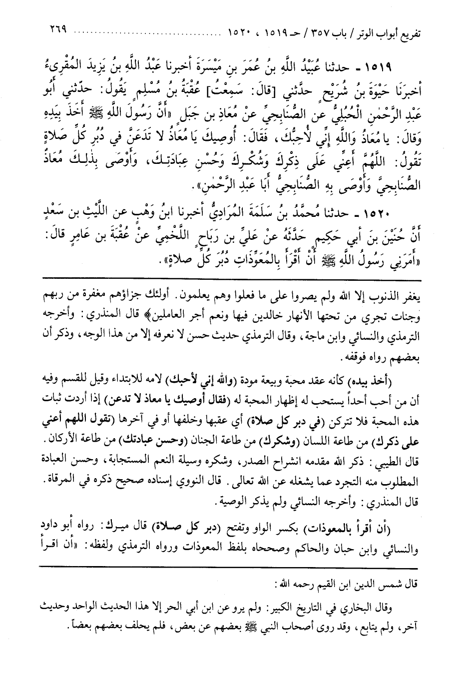 [1522] (أَخَذَ بِيَدِهِ) كَأَنَّهُ عَقَدُ مَحَبَّةٍ وَبَيْعَةُ مَوَدَّةٍ (وَاللَّهِ إِنِّي لَأُحِبُّكَ) لَامُهُ لِلِابْتِدَاءِ وَقِيلَ لِلْقَسَمِ وَفِيهِ أَنَّ مَنْ أَحَبَّ أَحَدًا يُسْتَحَبُّ لَهُ إِظْهَارُ الْمَحَبَّةِ لَهُ (فَقَالَ أُوصِيكَ يامعاذ لَا تَدَعَنَّ) إِذَا أَرَدْتَ ثَبَاتَ هَذِهِ الْمَحَبَّةِ فَلَا تَتْرُكَنَّ (فِي دُبُرِ كُلِّ صَلَاةٍ) أَيْ عَقِبَهَا وَخَلْفَهَا أَوْ فِي آخِرِهَا (تَقُولُ اللَّهُمَّ أَعِنِّي عَلَى ذِكْرِكَ) مِنْ طَاعَةِ اللِّسَانِ (وَشُكْرِكَ) مِنْ طَاعَةِ الْجَنَانِ (وَحُسْنِ عِبَادَتِكَ) مِنْ طَاعَةِ الْأَرْكَانِ