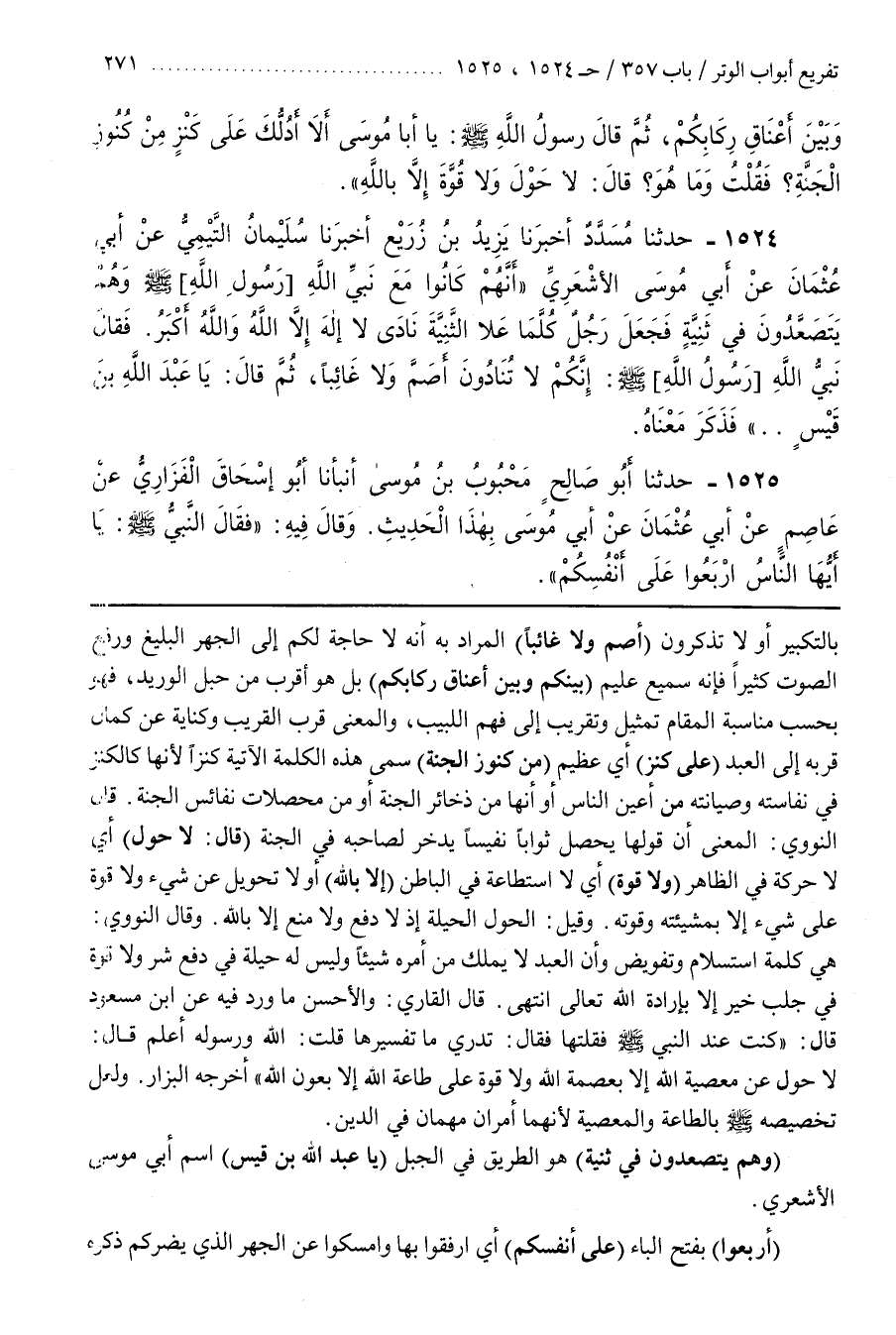 بِالتَّكْبِيرِ أَوْ لَا تَذْكُرُونَ (أَصَمَّ وَلَا غَائِبًا) الْمُرَادُ بِهِ أَنَّهُ لَا حَاجَةَ لَكُمْ إِلَى الْجَهْرِ الْبَلِيغِ وَرَفْعِ الصَّوْتِ كَثِيرًا فَإِنَّهُ سَمِيعٌ عَلِيمٌ (بَيْنَكُمْ وَبَيْنَ أَعْنَاقِ رِكَابِكُمْ) بَلْ هُوَ أَقْرَبُ مِنْ حَبْلِ الْوَرِيدِ فَهُوَ بِحَسَبِ مُنَاسَبَةِ الْمَقَامِ تَمْثِيلٌ وَتَقْرِيبٌ إِلَى فَهْمِ اللَّبِيبِ وَالْمَعْنَى قُرْبُ التَّقْرِيبِ وَكِنَايَةٌ عَنْ كَمَالِ قُرْبِهِ إِلَى الْعَبْدِ (عَلَى كَنْزٍ) أَيْ عَظِيمٍ (مِنْ كُنُوزِ الْجَنَّةِ) سَمَّى هَذِهِ الْكَلِمَةَ الْآتِيَةَ كَنْزًا لِأَنَّهَا كالكنز في نفاسته وصيانيه مِنْ أَعْيُنِ النَّاسِ أَوْ أَنَّهَا مِنْ ذَخَائِرِ الْجَنَّةِ أَوْ مِنْ مُحَصِّلَاتِ نَفَائِسِ الْجَنَّةِ