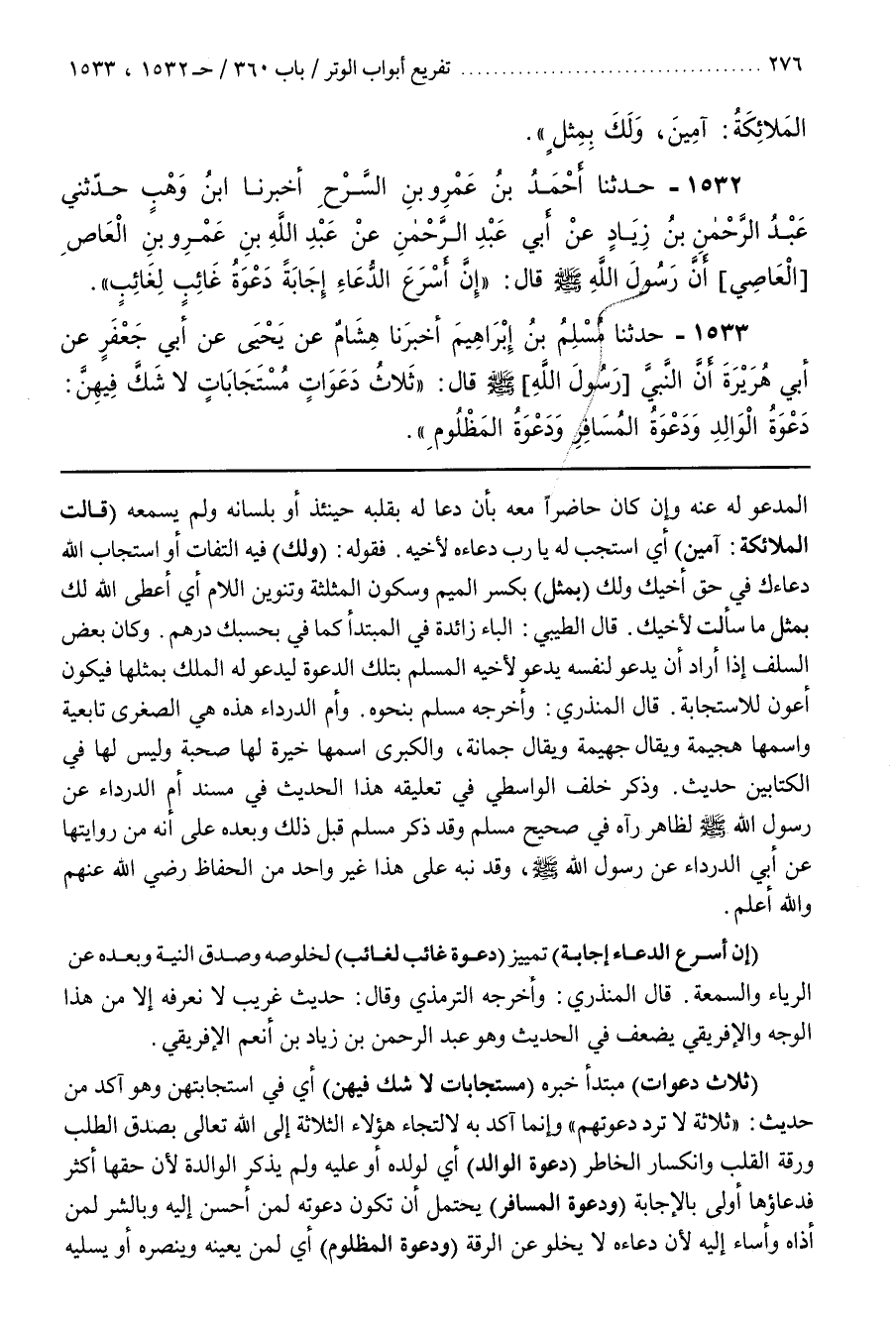 [1535] (إِنَّ أَسْرَعَ الدُّعَاءِ إِجَابَةً) تُمَيَّزُ (دَعْوَةُ غَائِبٍ لِغَائِبٍ) لِخُلُوصِهِ وَصِدْقِ النِّيَّةِ وَبُعْدِهِ عَنِ الرِّيَاءِ وَالسُّمْعَةِ