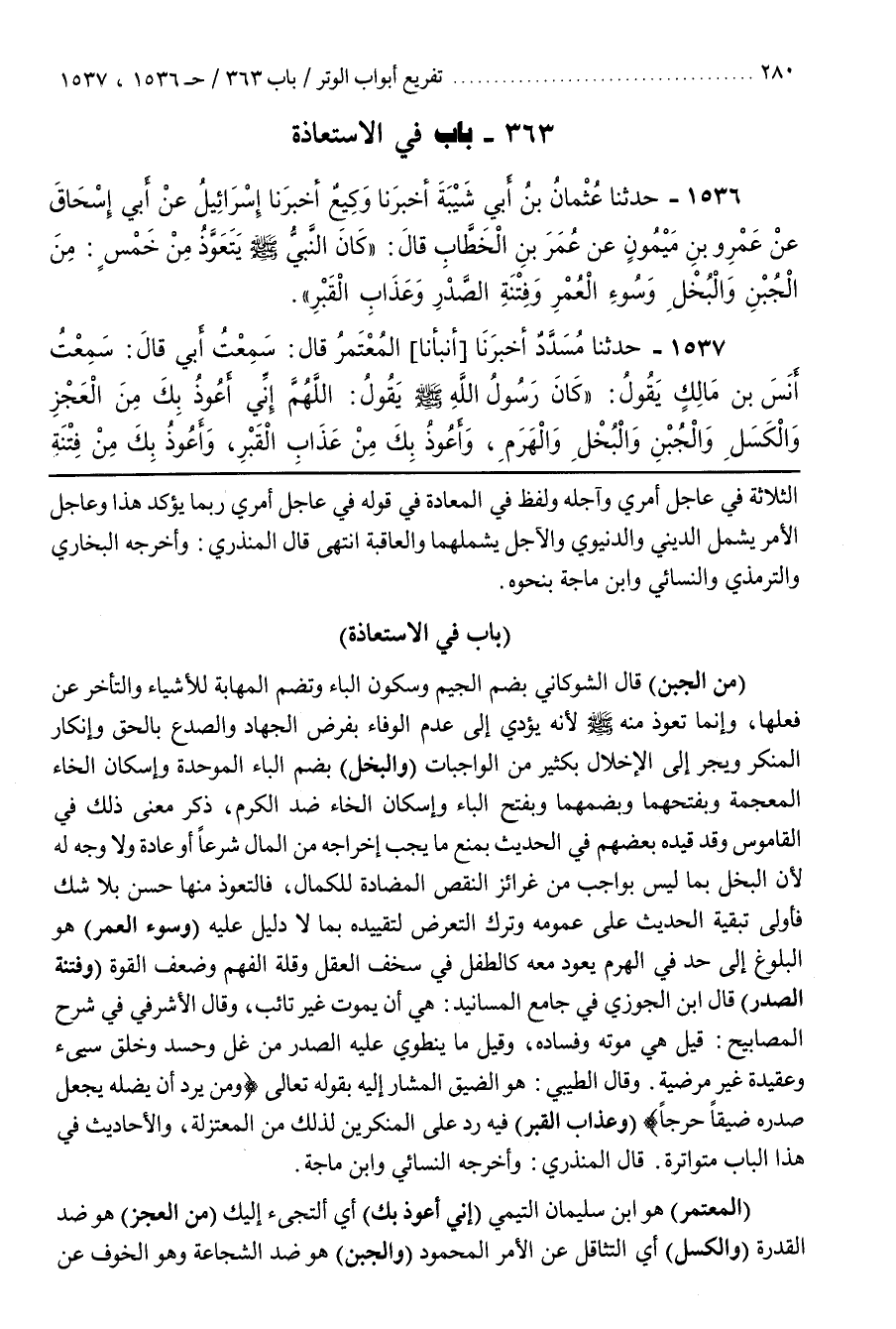 [1540] (المعتمر) هو بن سليمان التيمي (إني أعوذ بك) أي ألتجىء إِلَيْكَ (مِنَ الْعَجْزِ) هُوَ ضِدُّ الْقُدْرَةِ (وَالْكَسَلِ) أَيِ التَّثَاقُلُ عَنِ الْأَمْرِ الْمَحْمُودِ (وَالْجُبْنِ) هُوَ ضِدُّ الشُّجَاعَةِ وَهُوَ الْخَوْفُ عِنْدَ