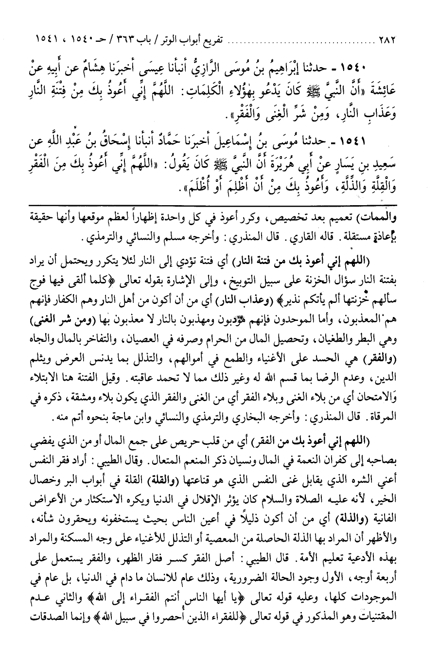 [1544] (اللَّهُمَّ إِنِّي أَعُوذُ بِكَ مِنَ الْفَقْرِ) أَيْ مِنْ قَلْبٍ حَرِيصٍ عَلَى جَمْعِ الْمَالِ أَوْ مِنَ الَّذِي يُفْضِي بِصَاحِبِهِ إِلَى كُفْرَانِ النِّعْمَةِ فِي الْمَالِ وَنِسْيَانِ ذِكْرِ الْمُنْعِمِ الْمُتَعَالِ