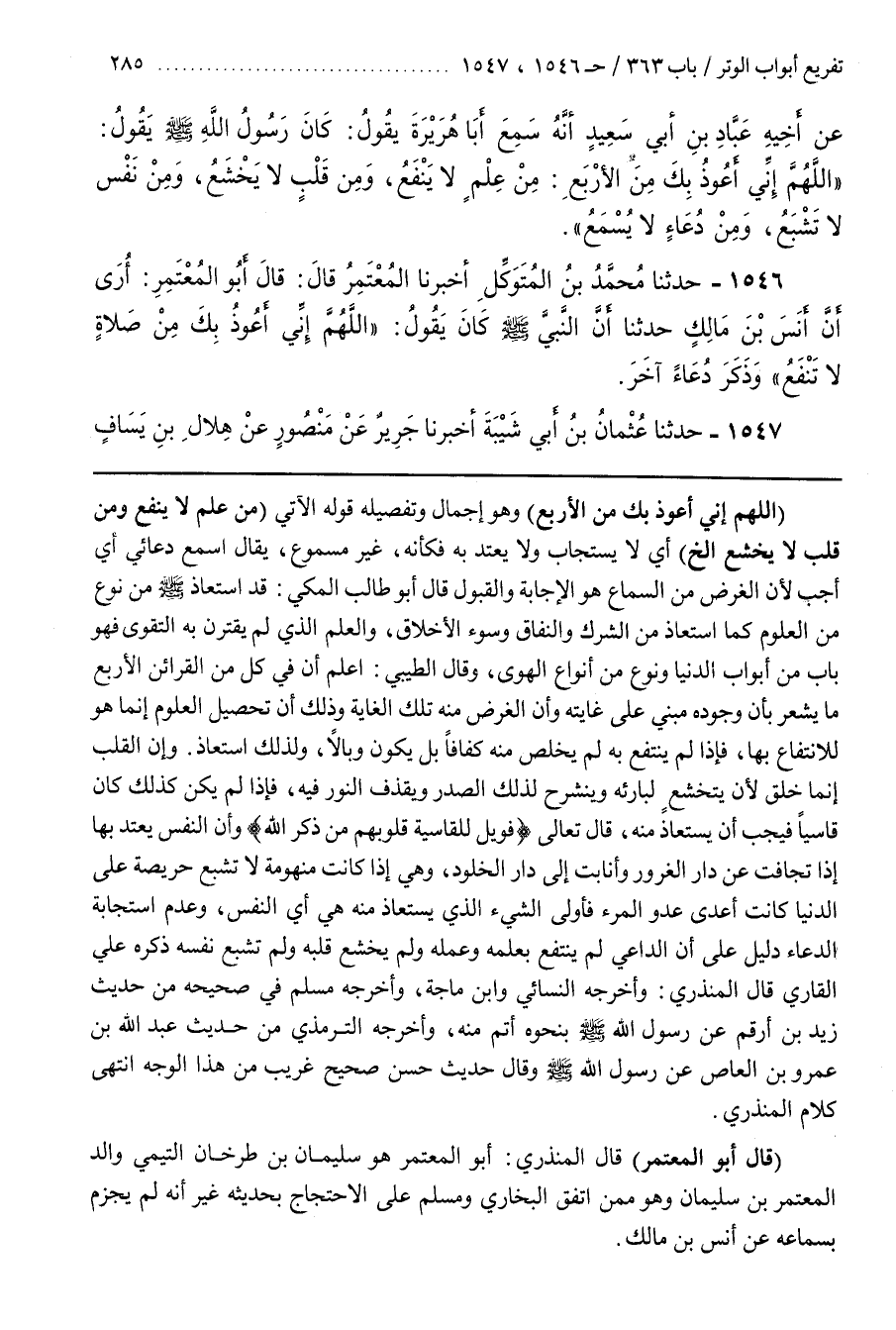 [1548] (اللَّهُمَّ إِنِّي أَعُوذُ بِكَ مِنَ الْأَرْبَعِ) وَهُوَ إِجْمَالٌ وَتَفْصِيلُهُ قَوْلُهُ الْآتِي (مِنْ عِلْمٍ لَا ينفع ومن قلب لايخشع إِلَخْ) أَيْ لَا يُسْتَجَابُ وَلَا يُعْتَدُّ بِهِ فَكَأَنَّهُ غَيْرُ مَسْمُوعٍ يُقَالُ اسْمَعْ دُعَائِي أَيْ أَجِبْ لِأَنَّ الْغَرَضَ مِنَ السَّمَاعِ هُوَ الْإِجَابَةُ وَالْقَبُولُ قَالَ أَبُو طَالِبٍ الْمَكِّيُّ قَدِ اسْتَعَاذَ مِنْ نَوْعٍ مِنَ الْعُلُومِ كَمَا اسْتَعَاذَ مِنَ الشِّرْكِ وَالنِّفَاقِ وَسُوءِ الْأَخْلَاقِ وَالْعِلْمِ الَّذِي لَمْ يَقْتَرِنْ بِهِ التَّقْوَى فَهُوَ بَابٌ مِنْ أَبْوَابِ الدُّنْيَا وَنَوْعٌ مِنْ أَنْوَاعِ الْهَوَى وَقَالَ الطِّيبِيُّ اعْلَمْ أَنَّ فِي كُلٍّ مِنَ الْقَرَائِنِ الْأَرْبَعِ مَا يُشْعِرُ بِأَنَّ وُجُودَهُ مَبْنِيٌّ عَلَى غَايَتِهِ وَأَنَّ الْغَرَضَ مِنْهُ تِلْكَ الْغَايَةُ وَذَلِكَ أَنَّ تَحْصِيلَ الْعُلُومِ إِنَّمَا هُوَ لِلِانْتِفَاعِ بِهَا فَإِذَا لَمْ يَنْتَفِعْ بِهِ لَمْ يَخْلُصْ مِنْهُ كَفَافًا بَلْ يَكُونُ وَبَالًا وَلِذَلِكَ اسْتَعَاذَ