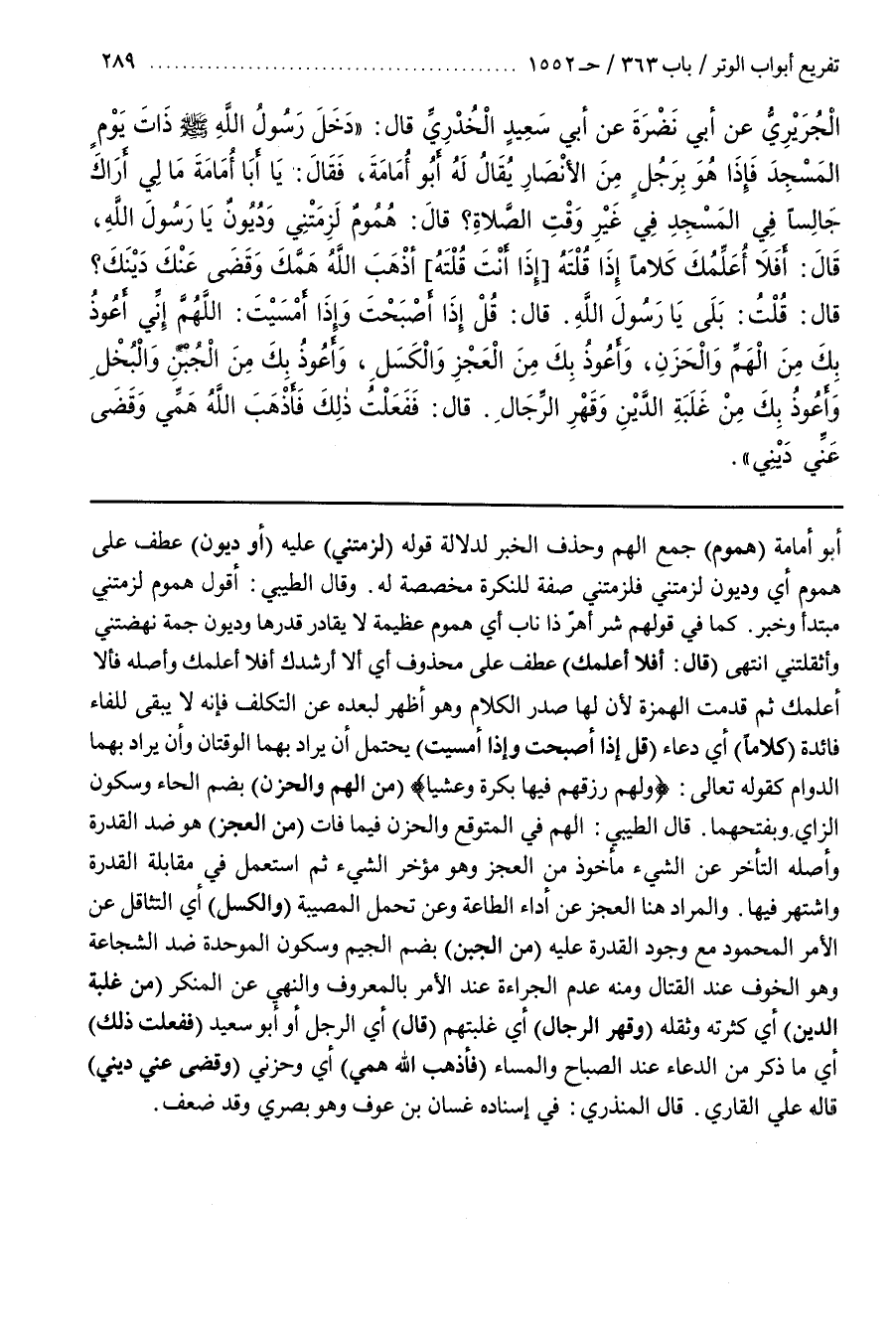 قَالَ الطِّيبِيُّ الْهَمُّ فِي الْمُتَوَقَّعِ وَالْحُزْنُ فِيمَا فَاتَ (مِنَ الْعَجْزِ) هُوَ ضِدُّ الْقُدْرَةِ وَأَصْلُهُ التَّأَخُّرُ عَنِ الشَّيْءِ مَأْخُوذٌ مِنَ الْعَجْزِ وَهُوَ مُؤَخَّرُ الشَّيْءِ ثُمَّ اسْتُعْمِلَ فِي مُقَابِلِهِ فِي مُقَابِلَةِ الْقُدْرَةِ وَاشْتُهِرَ فِيهَا وَالْمُرَادُ هُنَا الْعَجْزُ عَنْ أَدَاءِ الطَّاعَةِ وَعَنْ تَحَمُّلِ الْمُصِيبَةِ (وَالْكَسَلِ) أَيِ التَّثَاقُلِ عَنِ الْأَمْرِ الْمَحْمُودِ مَعَ وُجُودِ الْقُدْرَةِ عَلَيْهِ (مِنَ الْجُبْنِ) بِضَمِّ الْجِيمِ وَسُكُونِ الْمُوَحَّدَةِ ضِدُّ الشُّجَاعَةِ وَهُوَ الْخَوْفُ عِنْدَ الْقِتَالِ وَمِنْهُ عَدَمُ الْجَرَاءَةِ عِنْدَ الْأَمْرِ بِالْمَعْرُوفِ وَالنَّهْيِ عَنِ الْمُنْكَرِ (مِنْ غَلَبَةِ الدَّيْنِ) أَيْ كَثْرَتِهِ وَثِقَلِهِ (وَقَهْرِ الرِّجَالِ) أَيْ غَلَبَتِهِمْ (قَالَ) أَيِ الرَّجُلُ أَوْ أَبُو سَعِيدٍ (فَفَعَلْتُ ذَلِكَ) أَيْ مَا ذَكَرَ مِنَ الدُّعَاءِ عِنْدَ الصَّبَاحِ وَالْمَسَاءِ (فَأَذْهَبَ اللَّهُ هَمِّي) أَيْ حُزْنِي (وَقَضَى عني ديني) قاله علي القارىء
