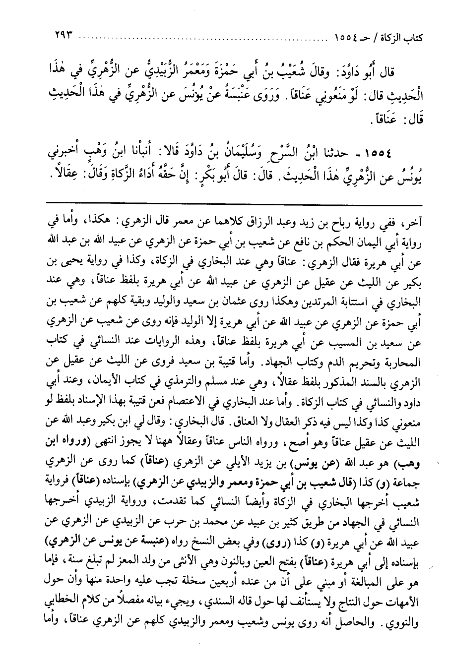 قال البخاري وقال لي بن بُكَيْرٍ وَعَبْدُ اللَّهِ عَنِ اللَّيْثِ عَنْ عُقَيْلٍ عَنَاقًا وَهُوَ أَصَحُّ وَرَوَاهُ النَّاسُ عَنَاقًا وَعِقَالًا ها هنا لا يجوز انتهى (ورواه بن وَهْبٍ) هُوَ عَبْدُ اللَّهِ (عَنْ يُونُسَ) بْنِ يَزِيدَ الْأَيْلِيِّ عَنِ الزُّهْرِيِّ (عَنَاقًا) كَمَا رَوَى عن الزهري جماعة كَذَا (قَالَ شُعَيْبُ بْنُ أَبِي حَمْزَةَ وَمَعْمَرٌ وَالزُّبَيْدِيُّ عَنِ الزُّهْرِيِّ) بِإِسْنَادِهِ (عَنَاقًا) فَرِوَايَةُ شُعَيْبٍ أَخْرَجَهَا الْبُخَارِيُّ فِي الزَّكَاةِ وَأَيْضًا النَّسَائِيُّ كَمَا تَقَدَّمَتْ وَرِوَايَةُ الزُّبَيْدِيِّ أَخْرَجَهَا النَّسَائِيُّ فِي الْجِهَادِ مِنْ طَرِيقِ كَثِيرِ بْنِ عُبَيْدٍ عَنْ مُحَمَّدِ بْنِ حَرْبٍ عَنِ الزُّبَيْدِيِّ عَنِ الزُّهْرِيِّ عَنْ عبيد الله عن أبي هريرة كَذَا (رَوَى) وَفِي بَعْضِ النُّسَخِ رَوَاهُ (عَنْبَسَةُ عَنْ يُونُسَ عَنِ الزُّهْرِيِّ) بِإِسْنَادِهِ إِلَى أَبِي هُرَيْرَةَ (عَنَاقًا) بِفَتْحِ الْعَيْنِ وَبِالنُّونِ وَهِيَ الْأُنْثَى مِنْ وَلَدِ الْمَعْزِ لَمْ تَبْلُغْ سَنَةً فَإِمَّا هُوَ عَلَى الْمُبَالَغَةِ أَوْ مَبْنِيٌّ عَلَى أَنَّ مَنْ عِنْدَهُ أَرْبَعِينَ سَخْلَةً تَجِبُ عَلَيْهِ وَاحِدَةٌ مِنْهَا وَأَنَّ حَوْلَ الْأُمَّهَاتِ حَوْلُ النِّتَاجِ وَلَا يُسْتَأْنَفُ لَهَا حَوْلٌ قَالَهُ السِّنْدِيُّ وَيَجِيءُ بَيَانُهُ مُفَصَّلًا مِنْ كَلَامِ الْخَطَّابِيِّ وَالنَّوَوِيِّ