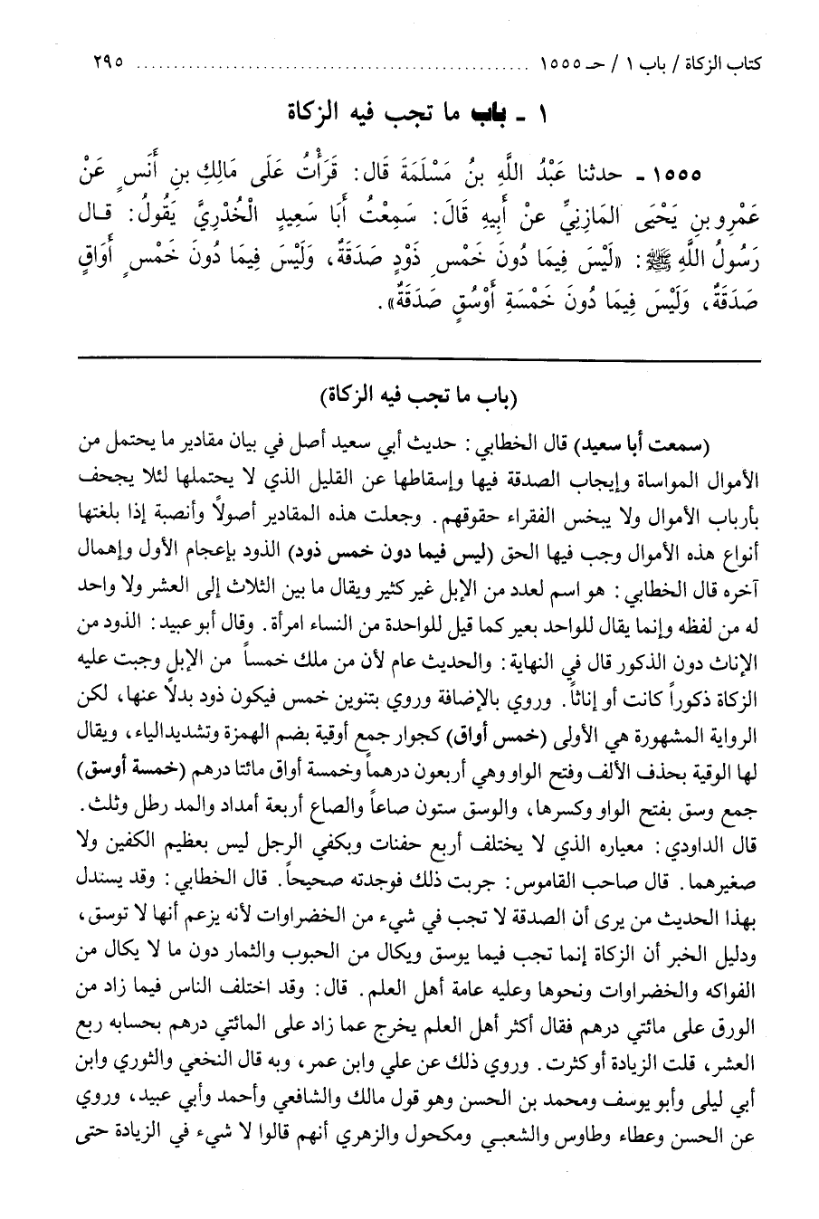 وَجُعِلَتْ هَذِهِ الْمَقَادِيرُ أُصُولًا وَأَنْصِبَةً إِذَا بَلَغَتْهَا أَنْوَاعُ هَذِهِ الْأَمْوَالِ وَجَبَ فِيهَا الْحَقُّ (لَيْسَ فِيمَا دُونَ خَمْسِ ذَوْدٍ) الذَّوْدُ بِإِعْجَامِ الْأَوَّلِ وَإِهْمَالِ آخِرِهِ قَالَ الْخَطَّابِيُّ هُوَ اسْمٌ لِعَدَدٍ مِنَ الْإِبِلِ غَيْرِ كَثِيرٍ وَيُقَالُ مَا بَيْنَ الثَّلَاثِ إِلَى الْعَشْرِ وَلَا وَاحِدَ لَهُ مِنْ لَفْظِهِ وَإِنَّمَا يُقَالُ لِلْوَاحِدِ بَعِيرٌ كَمَا قِيلَ لِلْوَاحِدَةِ مِنَ النِّسَاءِ امْرَأَةٌ