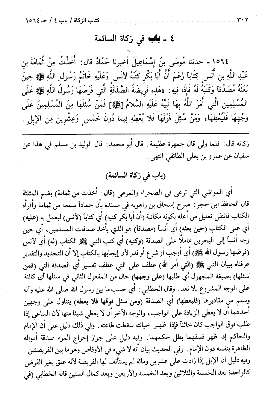 (قَالَ أَخَذْتُ مِنْ ثُمَامَةَ) بِضَمِّ الْمُثَلَّثَةِ قَالَ الحافظ بن حَجَرٍ صَرَّحَ إِسْحَاقُ بْنُ رَاهَوَيْهِ فِي مُسْنَدِهِ بِأَنَّ حَمَّادًا سَمِعَهُ مِنْ ثُمَامَةَ وَأَقْرَأَهُ الْكِتَابَ فَانْتَفَى تَعْلِيلُ مَنْ أَعَلَّهُ بِكَوْنِهِ مُكَاتَبَةً (أَنَّ أَبَا بَكْرٍ كَتَبَهُ) أَيْ كِتَابًا (لِأَنَسٍ) لِيَعْمَلَ بِهِ (عَلَيْهِ) أَيْ عَلَى الْكِتَابِ (حِينَ بَعَثَهُ) أَيْ أَنَسًا (مُصَدِّقًا) هُوَ الَّذِي يَأْخُذُ صَدَقَاتِ الْمُسْلِمِينَ أَيْ حِينَ وَجَّهَ أَنَسًا إِلَى الْبَحْرَيْنِ عَامِلًا عَلَى الصَّدَقَةِ (وَكَتَبَهُ) أَيْ كَتَبَ النَّبِيُّ الْكِتَابَ (لَهُ) أَيْ لِأَنَسٍ (فَرَضَهَا رَسُولُ اللَّهِ) أَيْ أَوْجَبَ أَوْ شَرَعَ أَوْ قَدَّرَ لِأَنَّ إِيجَابَهَا بِالْكِتَابِ إِلَّا أَنَّ التَّحْدِيدَ وَالتَّقْدِيرَ عَرَفْنَاهُ ببيان النبي (الَّتِي أَمَرَ اللَّهُ) عَطْفٌ عَلَى الَّتِي عَطْفَ تفسير أي الصدقة التي (فمن سألها) بِصِيغَةِ الْمَجْهُولِ أَيْ طُلِبَهَا (عَلَى وَجْهِهَا) حَالٌ مِنَ الْمَفْعُولِ الثَّانِي فِي سُئِلَهَا أَيْ كَائِنَةً عَلَى الْوَجْهِ الْمَشْرُوعِ بِلَا تَعَدٍّ