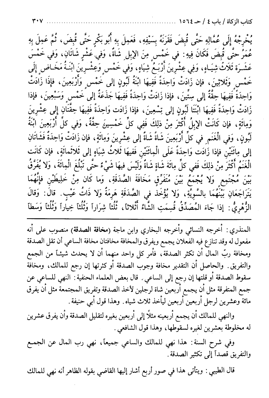 [1568] (مَخَافَةَ الصَّدَقَةِ) مَنْصُوبٌ عَلَى أَنَّهُ مَفْعُولٌ لَهُ وَقَدْ تَنَازَعَ فِيهِ الْفِعْلَانِ يَجْمَعُ وَيُفَرِّقُ وَالْمَخَافَةُ مَخَافَتَانِ مَخَافَةُ السَّاعِي أَنْ تَقِلَّ الصَّدَقَةُ وَمَخَافَةُ رَبِّ الْمَالِ أَنْ تَكْثُرَ الصَّدَقَةُ فَأَمَرَ كُلَّ وَاحِدٍ مِنْهُمَا أَنْ لَا يُحْدِثَ شَيْئًا مِنَ الْجَمْعِ وَالتَّفْرِيقِ
