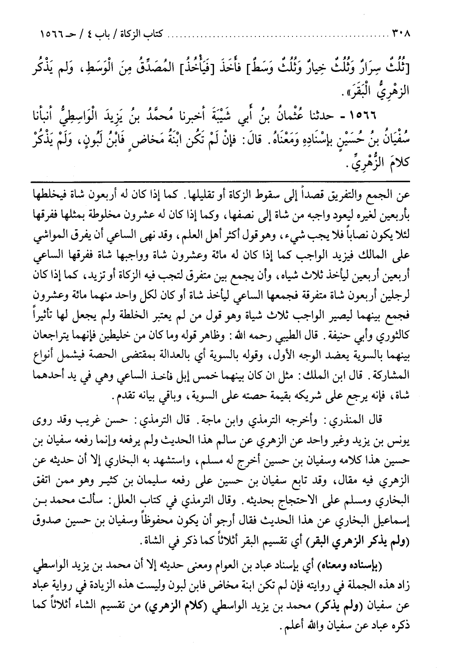 [1569] (بِإِسْنَادِهِ وَمَعْنَاهُ) أَيْ بِإِسْنَادِ عَبَّادِ بْنِ الْعَوَّامِ وَمَعْنَى حَدِيثِهِ إِلَّا أَنَّ مُحَمَّدَ بْنَ يَزِيدَ الْوَاسِطِيَّ زَادَ هَذِهِ الْجُمْلَةَ فِي رِوَايَتِهِ فَإِنْ لَمْ تَكُنِ ابْنَةُ مَخَاضٍ فَابْنُ لَبُونٍ وَلَيْسَتْ هَذِهِ الزِّيَادَةُ فِي رِوَايَةِ عَبَّادٍ عَنْ سُفْيَانَ (وَلَمْ يَذْكُرْ) مُحَمَّدُ بْنُ يَزِيدَ الْوَاسِطِيُّ (كَلَامَ الزُّهْرِيِّ) مِنْ تَقْسِيمِ الشاء أَثْلَاثًا كَمَا ذَكَرَهُ عَبَّادٌ عَنْ سُفْيَانَ وَاللَّهُ أعلم